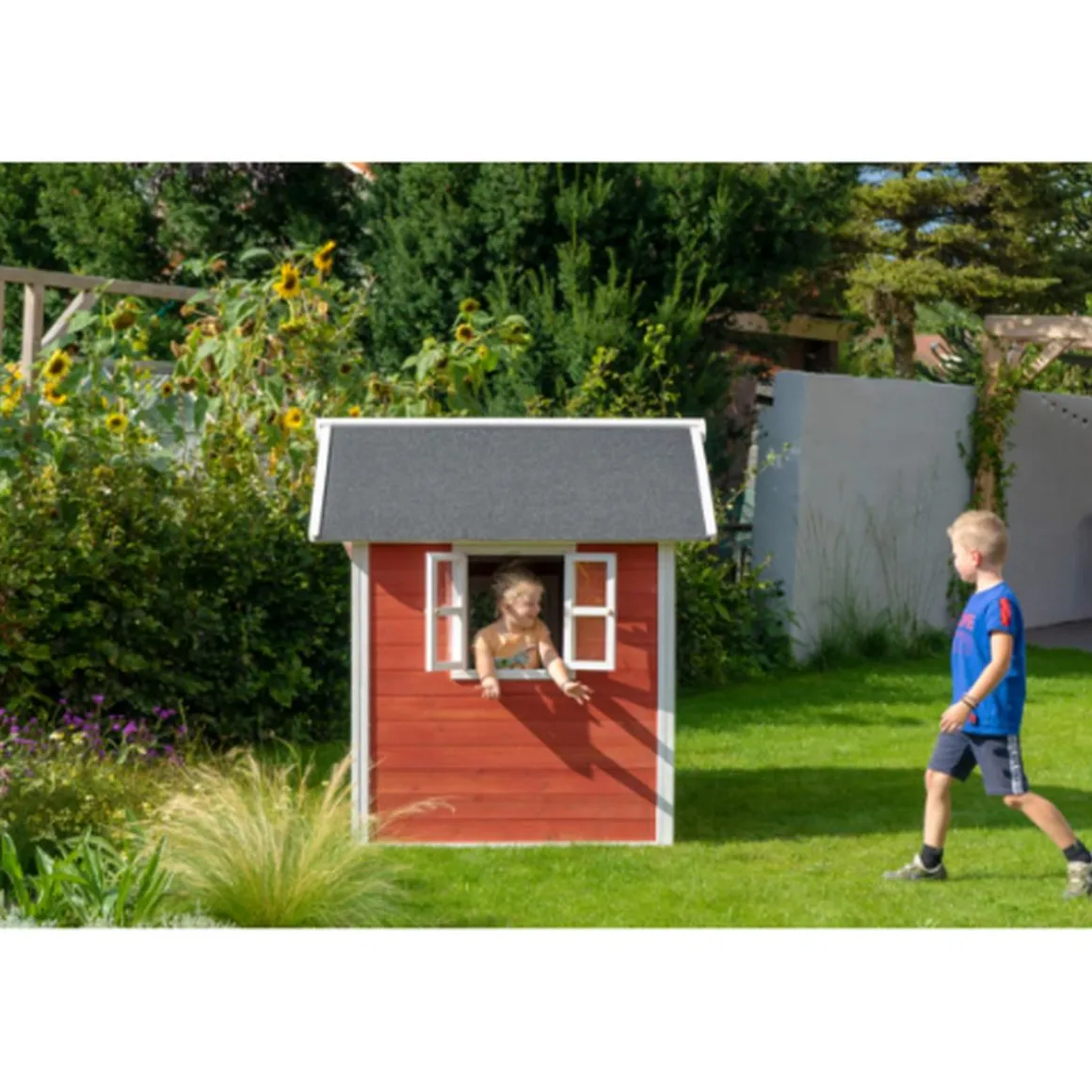 Esta casita de juegos de madera se encuentra en el suelo, ocupa poco espacio y, por lo tanto, es adecuada para cualquier jardín. La casita de juegos es fácil de montar debido a sus partes prefabricadas.