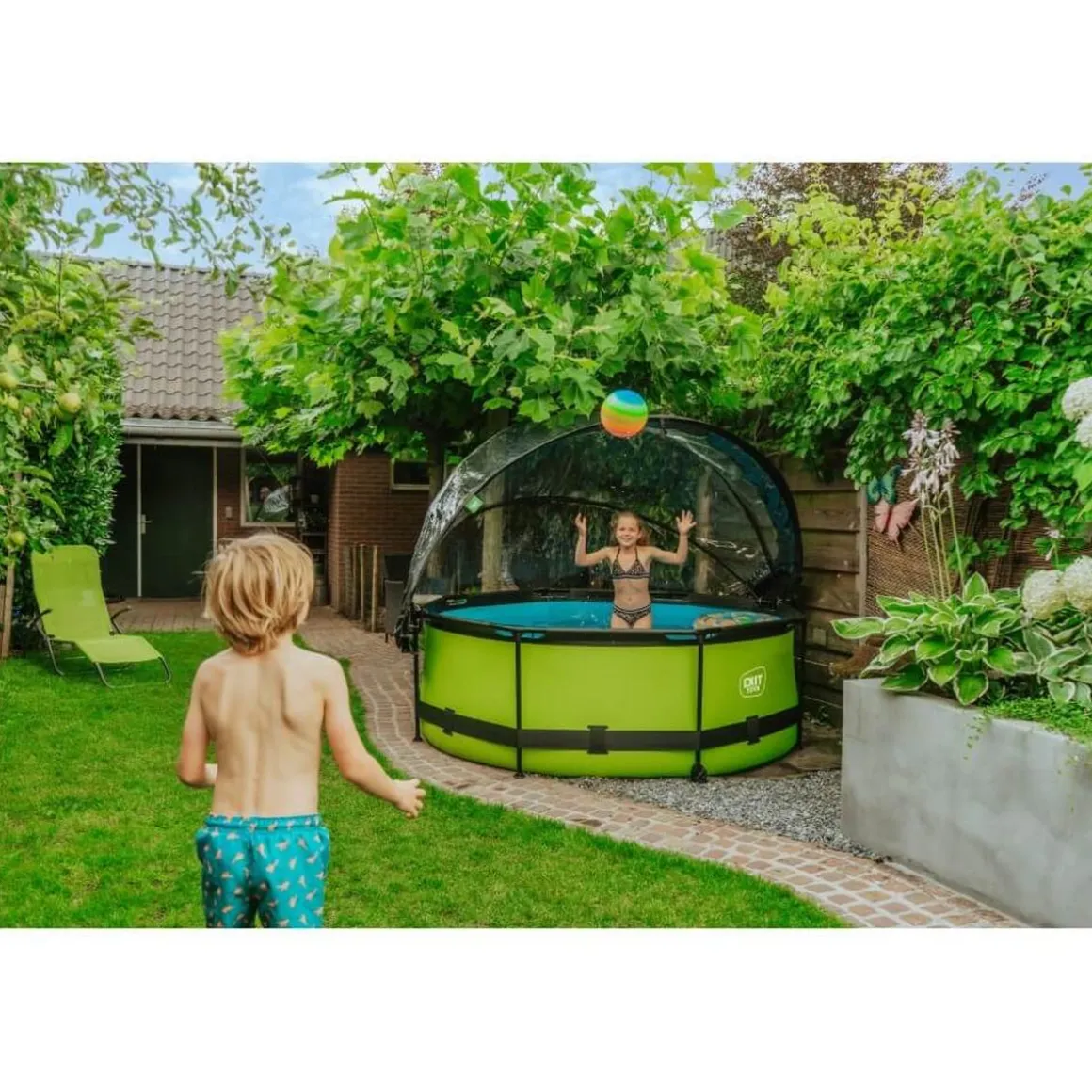 Exit – Piscina Lime verde diámetro 244 x 76 cm con filtro y cúpula transparente, una piscina redonda de color verde lima que se integra perfectamente en tu jardín.