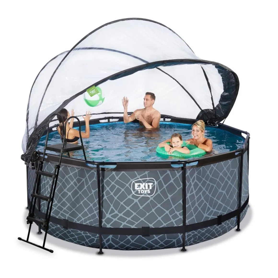 Exit – Piscina Stone efecto piedra gris diámetro 360 x 122 cm con filtro de arena y cúpula transparente, una piscina redonda con efecto de piedra y cúpula.
