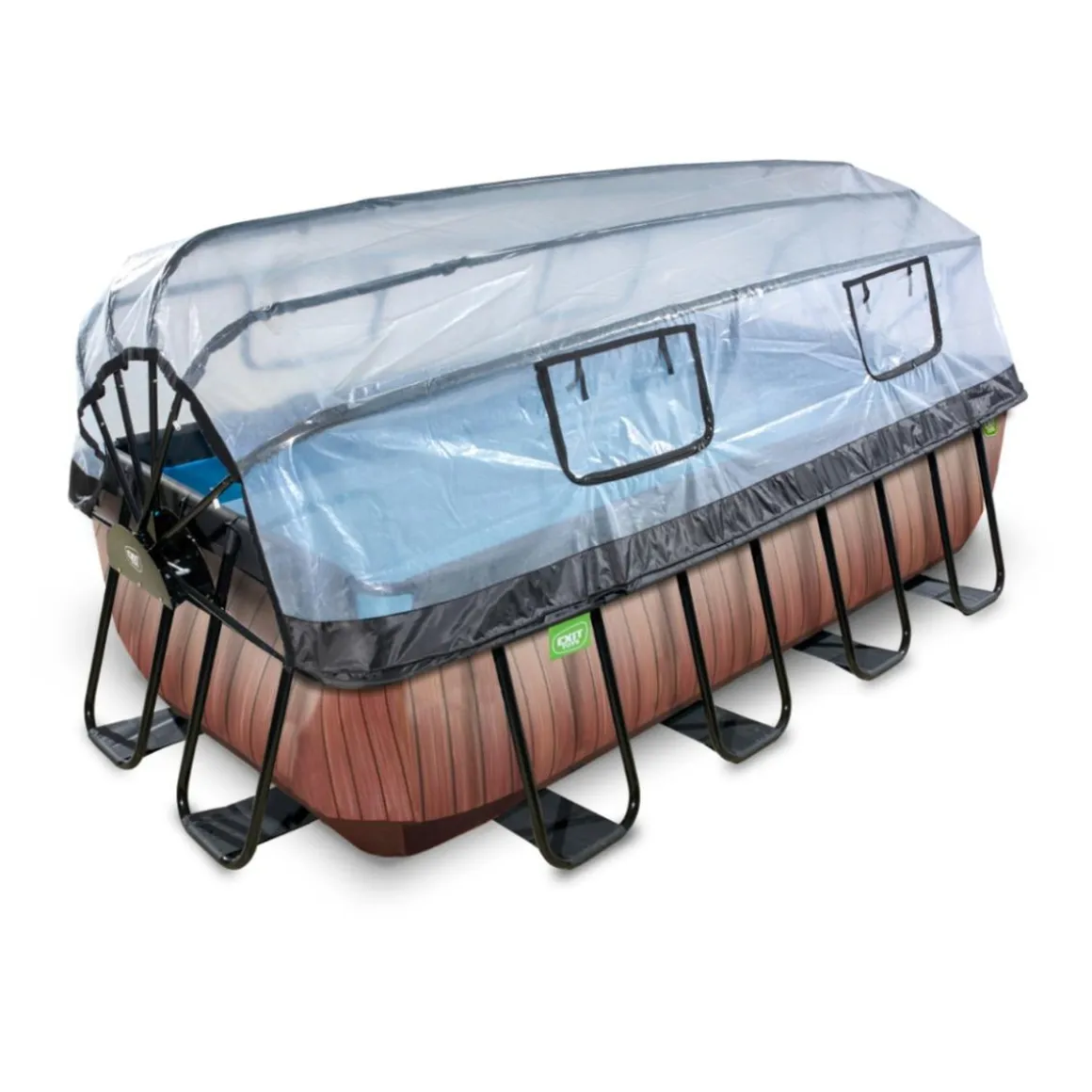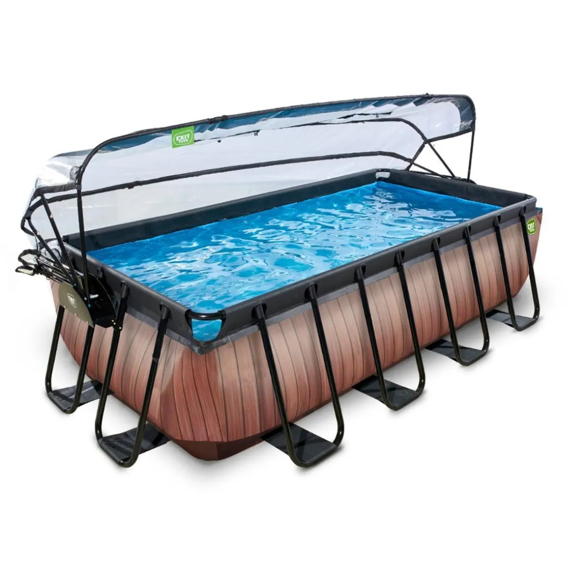 Exit – Piscina Wood efecto madera 400 x 200 x 100 cm con filtro de arena y cubierta protectora, una piscina de marco rectangular con aspecto de madera y con cúpula.