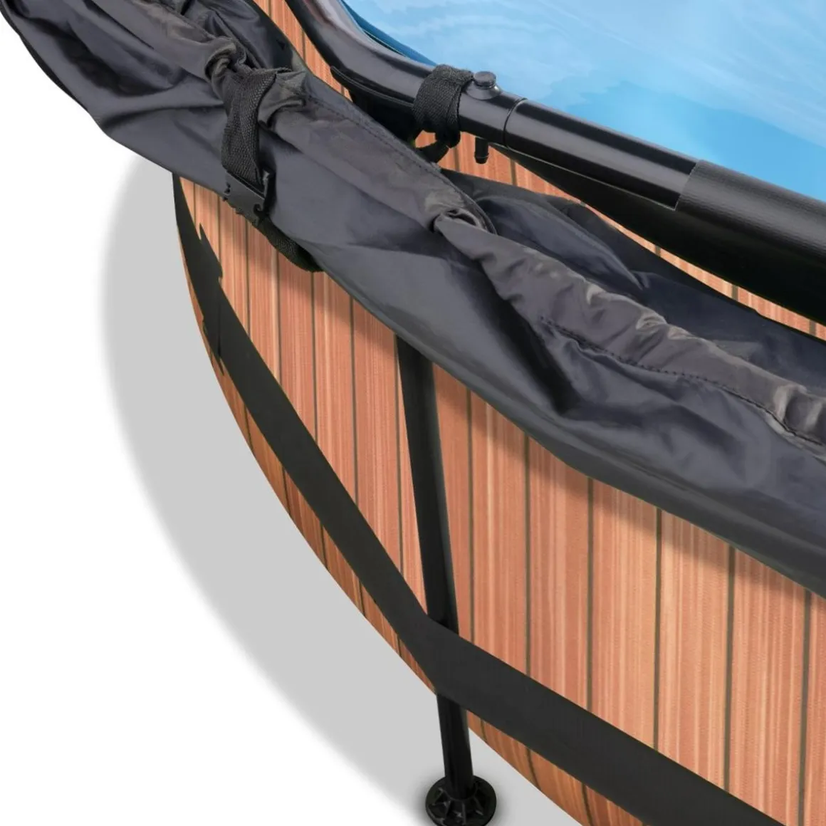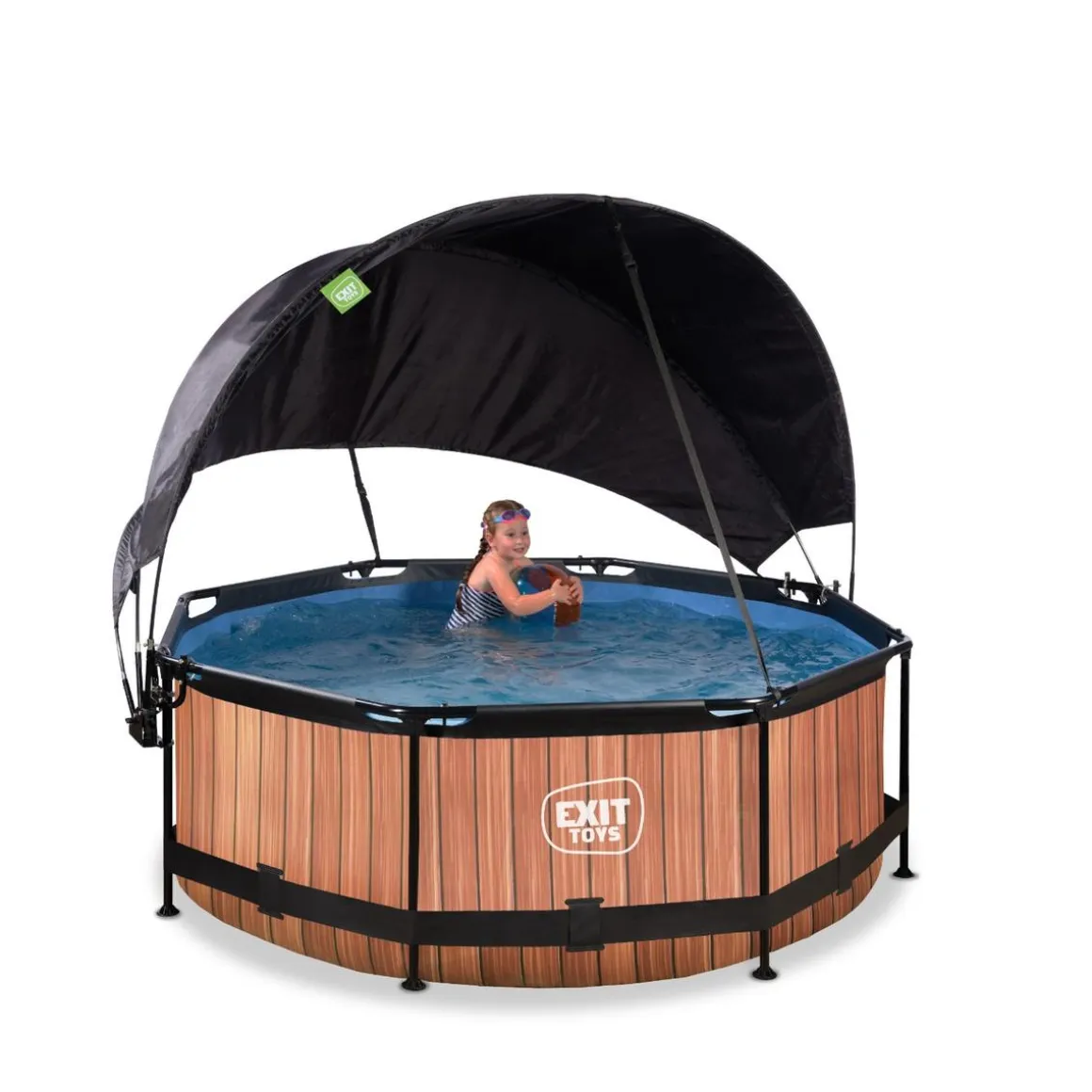 Exit – Piscina Wood efecto madera marrón diámetro 244 x 76 cm con filtro y toldo negro, una piscina redonda con aspecto de madera que quedará perfecta en tu jardín.