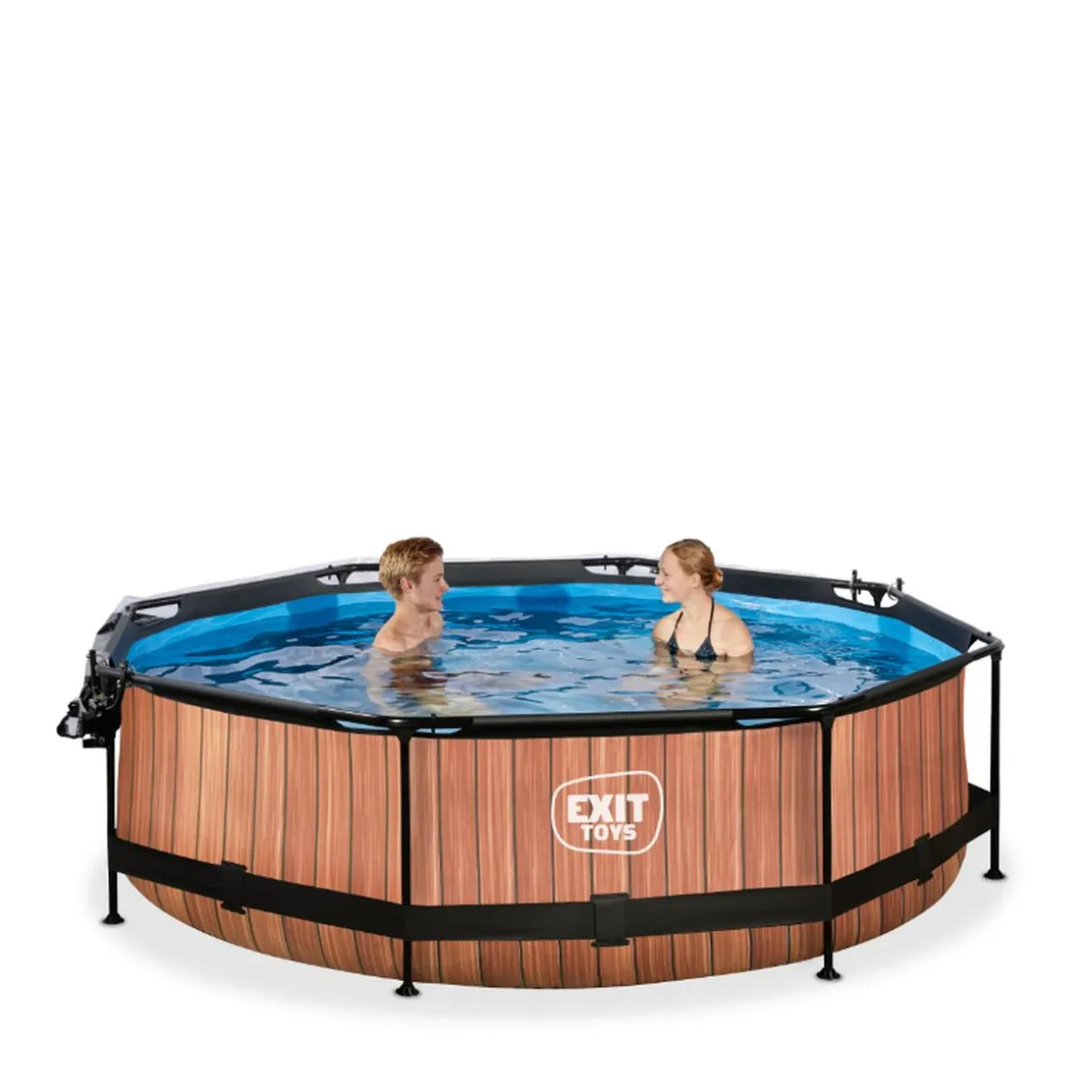 La piscina EXIT Wood 300 cm es una piscina de marco redondo con con cúpula. Esta piscina compacta contiene una bomba de filtro y realmente se destacas por su patrón de madera fresca.