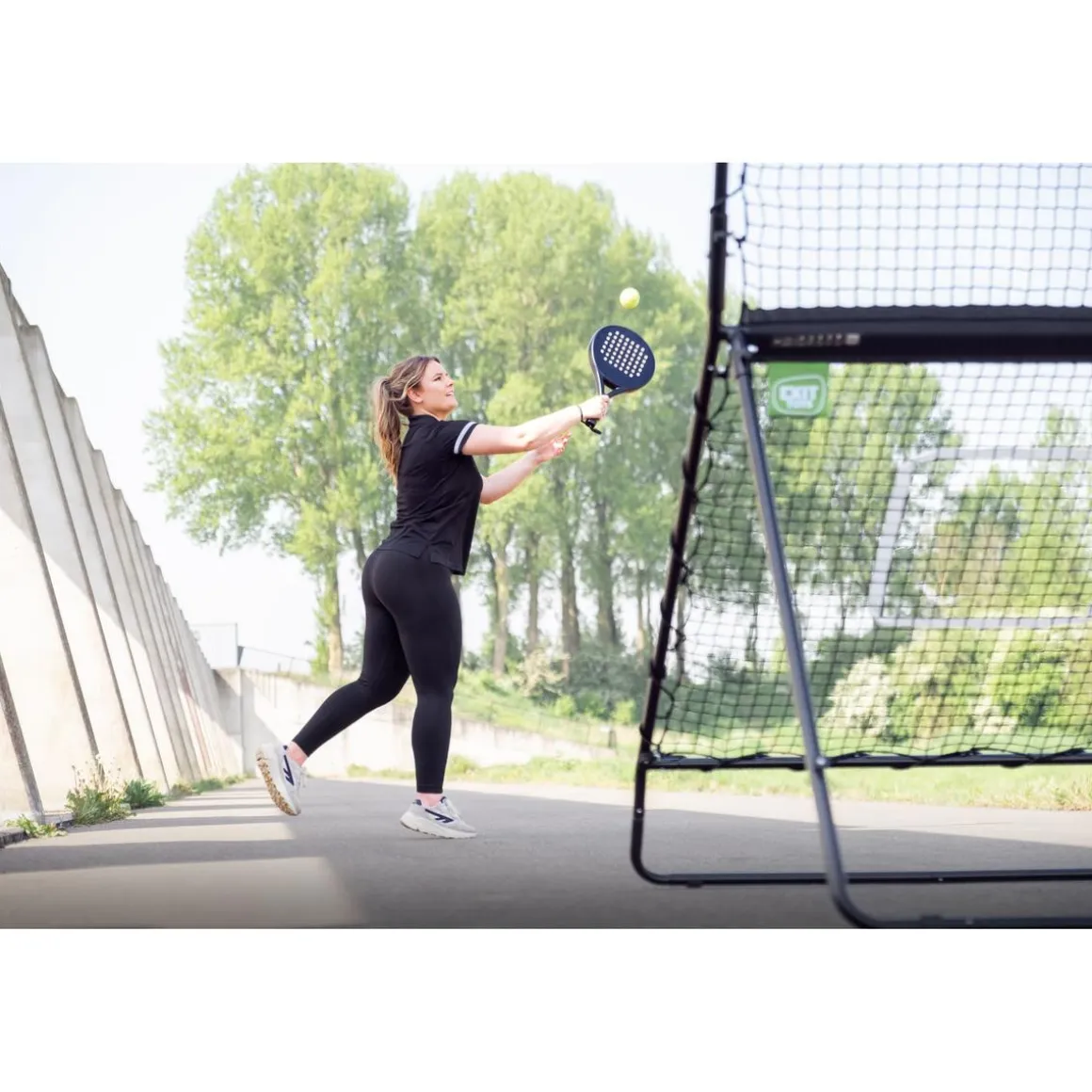 El reboteador de pádel consta de dos redes (cada una con un tamaño de 115 x 110 cm) para practicar diversos golpes de pádel. La red inferior es ideal para remates potentes y golpes como la víbora o la bandeja. La red superior es perfecta para golpes como la volea de derechas y volea de revés. La red superior del reboteador se puede ajustar a dos tensiones diferentes en un abrir y cerrar de ojos. Gracias a las diferentes tensiones de red, el reboteador de pádel Smash de Exit es adecuado para cada golpe y ofrece una experiencia de práctica versátil para jugadores de pádel de todos los niveles.