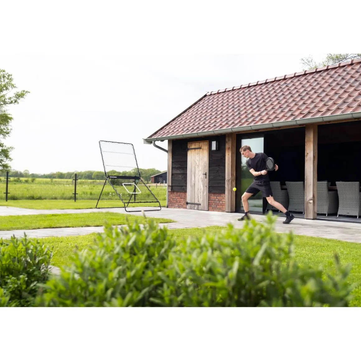 El reboteador Smash de pádel es 100% reparable, lo que significa que cada parte puede ser reemplazada. Además, el reboteador es casi completamente reciclable. Esto se debe a que se han utilizado principalmente materiales mono-materiales, es decir, materiales que consisten en un solo tipo de materia prima. Esto facilita su reciclaje ya que no es necesario separar los materiales. El marco metálico negro está galvanizado y recubierto de polvo. Gracias a ello, el reboteador puede resistir todas las condiciones climáticas sin dar oportunidad a la oxidación.