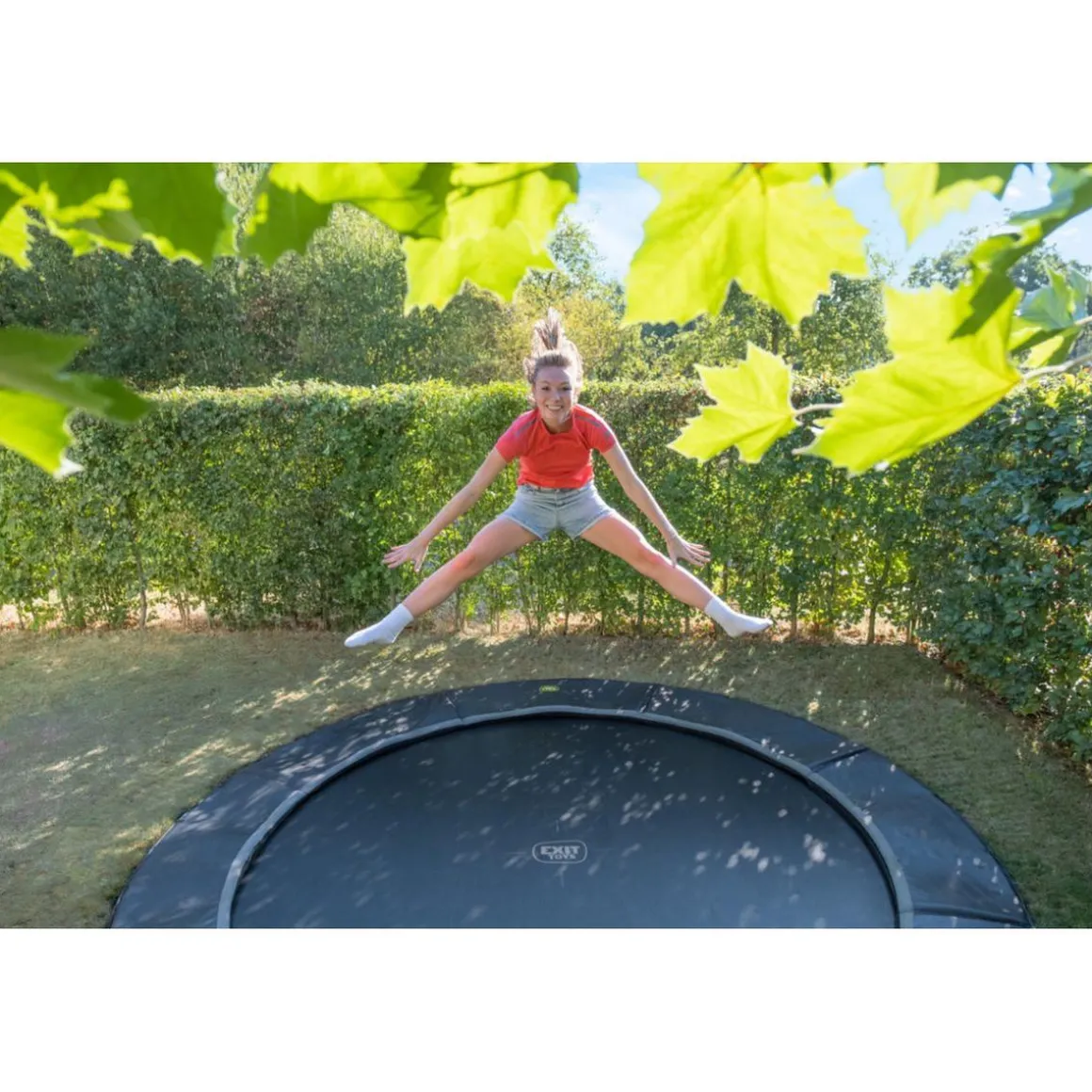 Para una sensación óptima de seguridad, este trampolín también está disponible con red de seguridad de alta calidad con puerta superpuesta o con los exclusivos paneles de seguridad EXIT Freezone (se vende por separado).