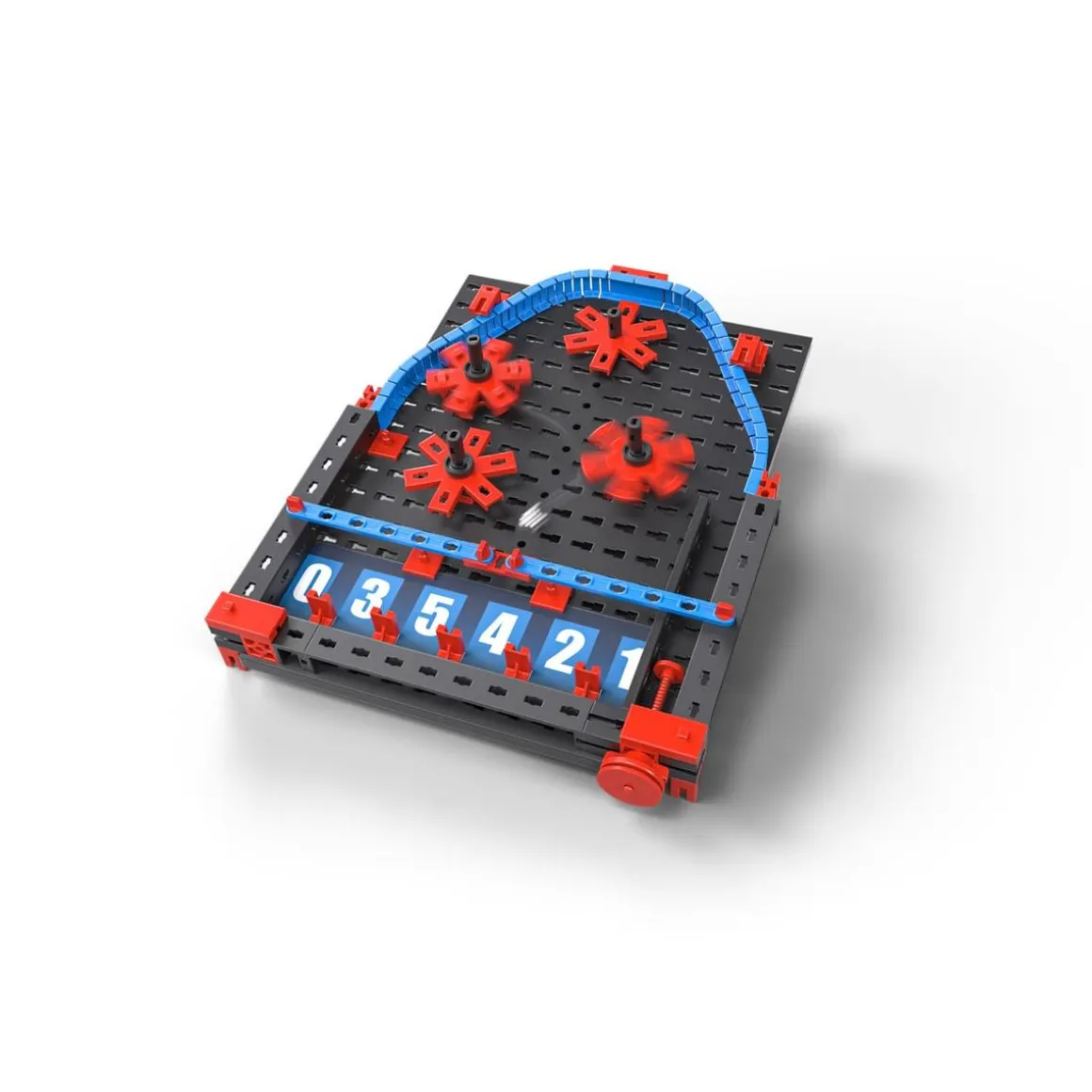 Fischer Technik – Pinball. Tres, dos, uno… ¡empieza! El balón se lanza al terreno de juego. Ahora tienes que tener cuidado, porque la pelota choca con varios obstáculos que influyen en su trayectoria por el campo de juego. ¿En qué número cae la pelota? ¿Quién acumula más puntos y gana el juego?