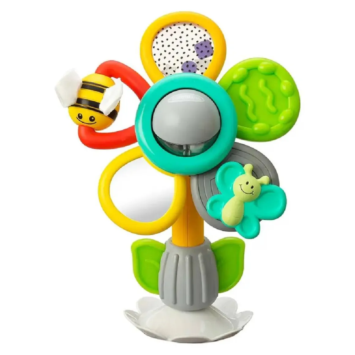 Tiene pétalos con diferentes texturas, una abejita giratoria, un espejo y bolitas que hacen ruido. Es ideal para desarrollar la motricidad y los sentidos táctil, auditivo y visual.