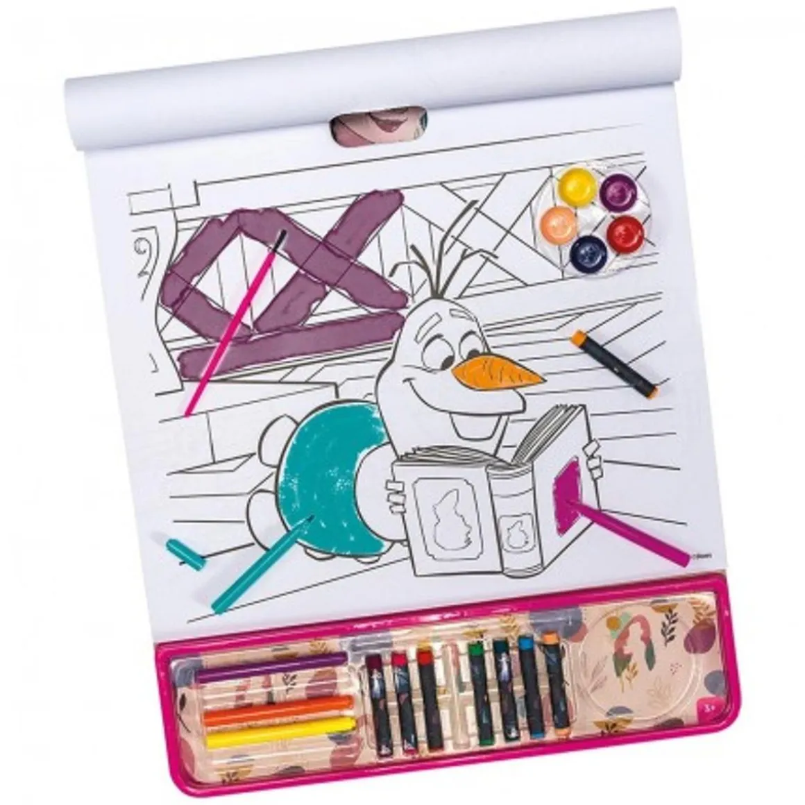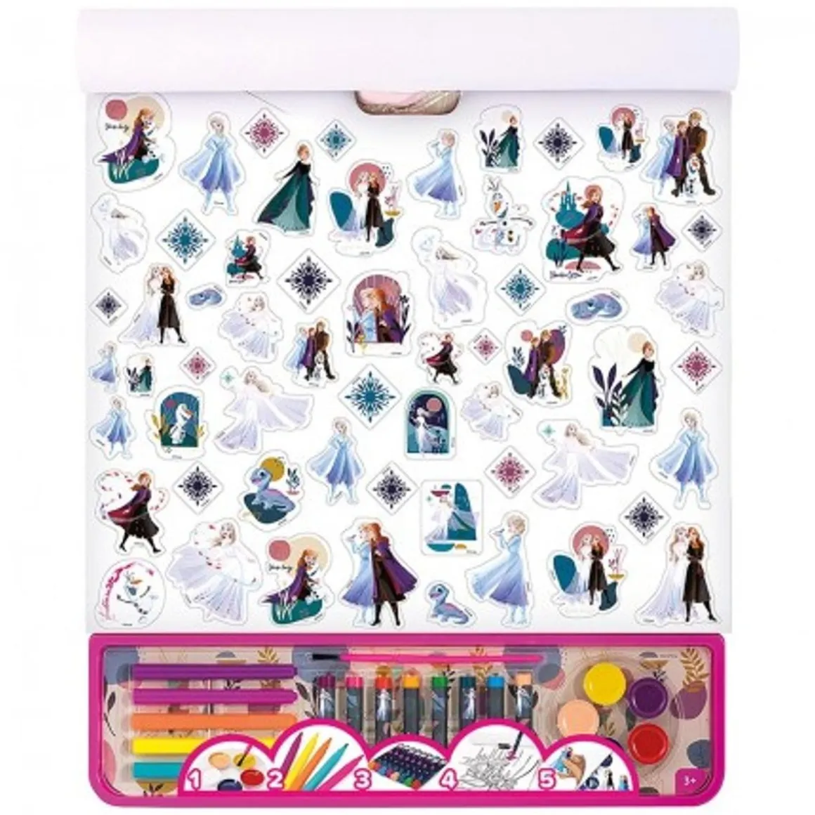 Este set de arte contiene una variedad de materiales para dibujar, pintar y colorear, para garantizar horas de diversión con la mano de Frozen y su mundo mágico. Contiene 5 acuarelas, 5 rotuladores, 8 lápices de colores, 1 pincel y 1 hoja de pegatinas para una experiencia artística variada. Todos los materiales son de papel FSC, lo que fomenta una gestión forestal responsable.