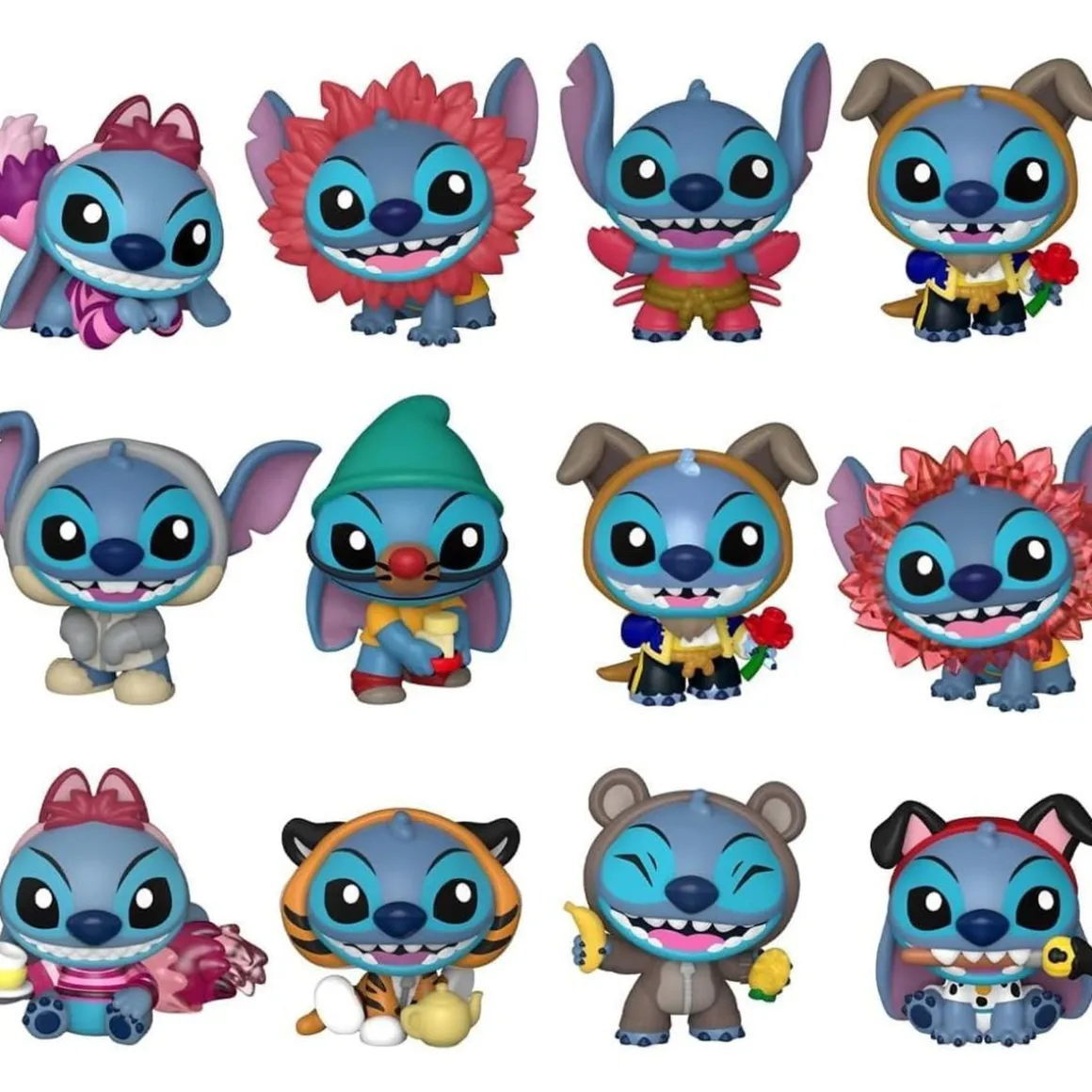 Entre los disfraces encontrarás a Stitch como Gato de Cheshire, Simba, Sebastian, la Bestia, Thumper, Gus Gus, Dumbo, Rajah, Pongo, Baloo, la Bestia (transparente) y Simba (transparente con brillo).
