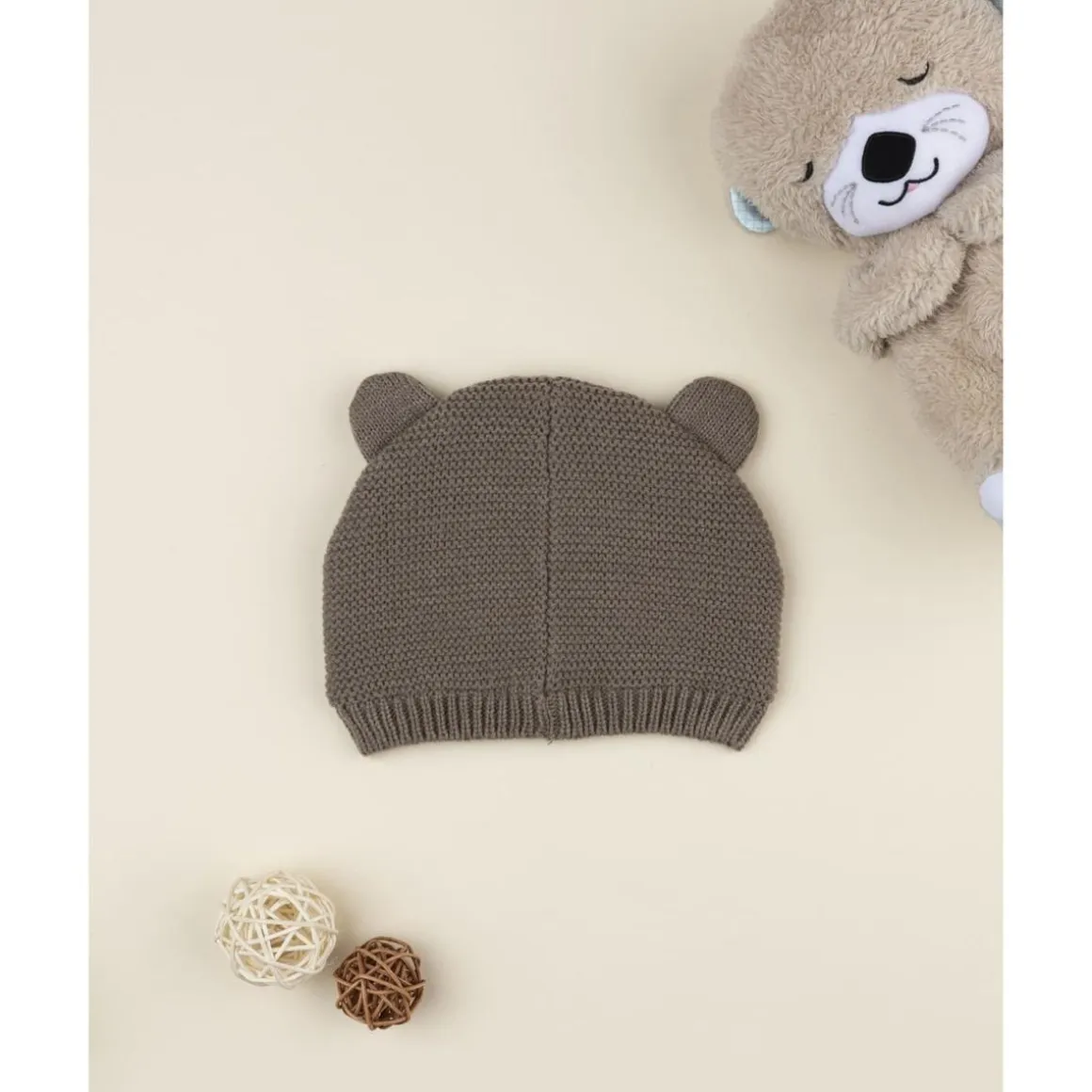 Tierno gorro tipo cuffia para niño en color marrón con estampado de ositos y orejitas a tono. Ajuste suave y cómodo para proteger la cabeza del bebé del frío.