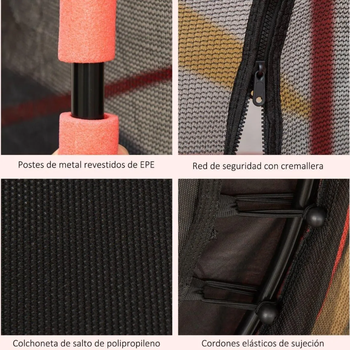 - Incluye una red alrededor de las patas para evitar que ni los niños ni las mascotas se metan debajo del trampolín.