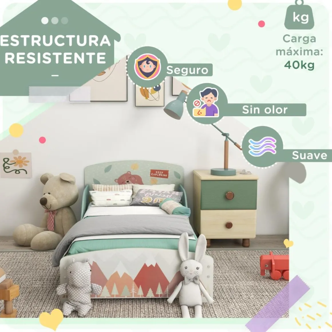 Homcom – Cama infantil Montañas Verde, una cama con un diseño bajo que permite que los niños pequeños puedan subir fácilmente.