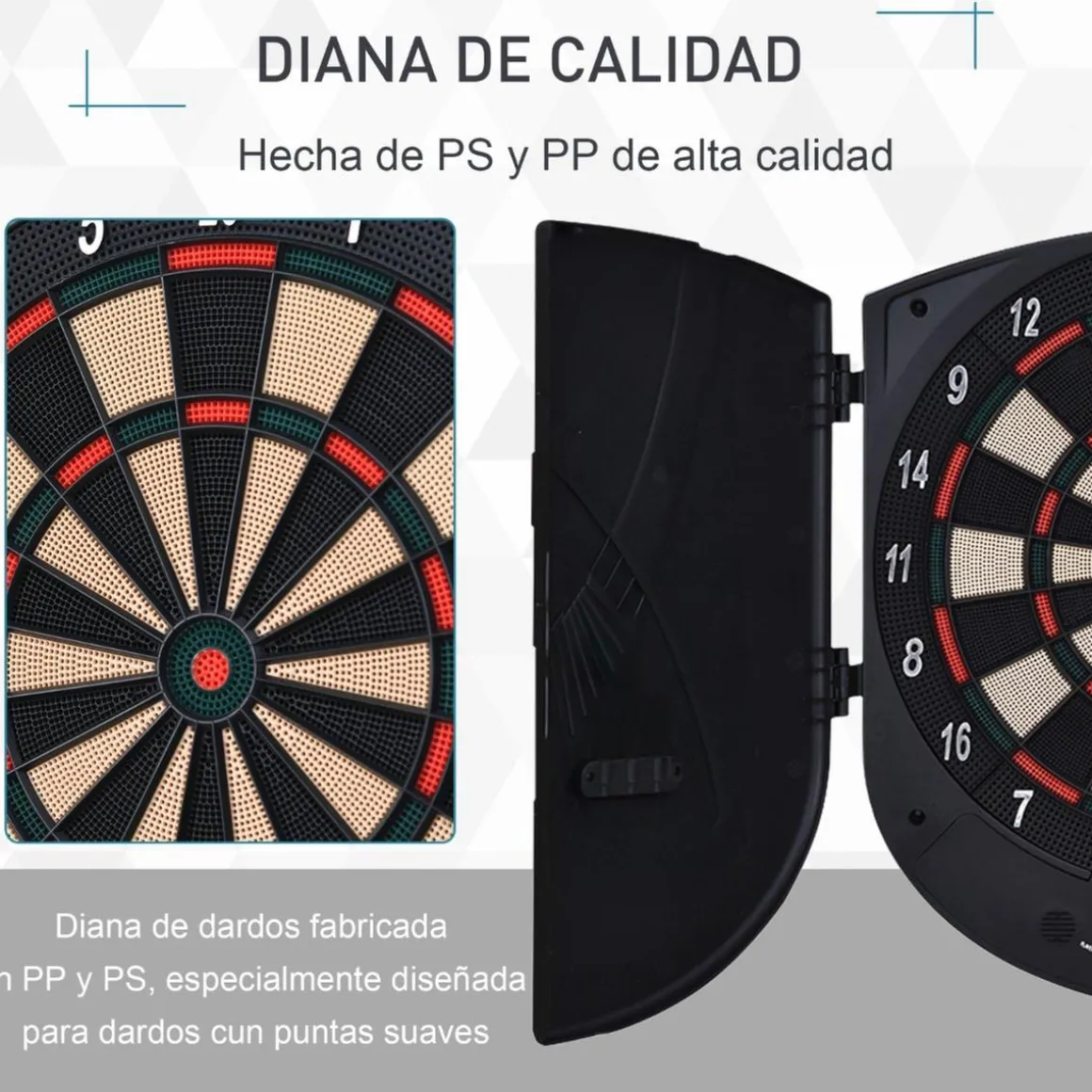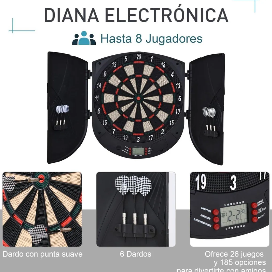 Homcom – Diana electrónica digital, con 26 juegos y 185 opciones de puntuación. Permite que jueguen al mismo tiempo hasta un máximo de 8 jugadores. Incluye 6 dardos.