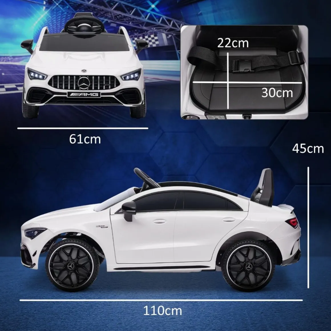Homcom – Mercedes Benz AMG CLA 45 eléctrico Blanco con mando, un coche para niños que combina elegancia y funcionalidad, ofreciendo una experiencia de conducción realista y emocionante para los pequeños pilotos.