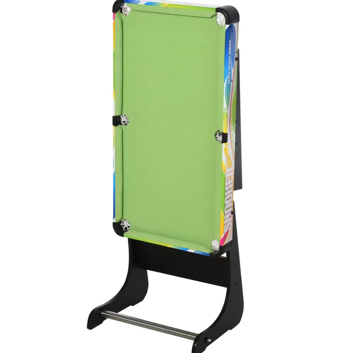 Incluye todo lo necesario para jugar, como raquetas y bolas, palo de billar y bolas, pelotas del futbolín, discos y empujadores de hockey, etc. Dimensiones: Mesa de fútbol 86,5 x 43,5 x 64 cm; billar 84 x 43,5 x 45,5 cm; mesa de hockey 69,5 x 34,3 x 46 cm; mesa de ping-pong 69,8 x 34,6 x 46 cm.