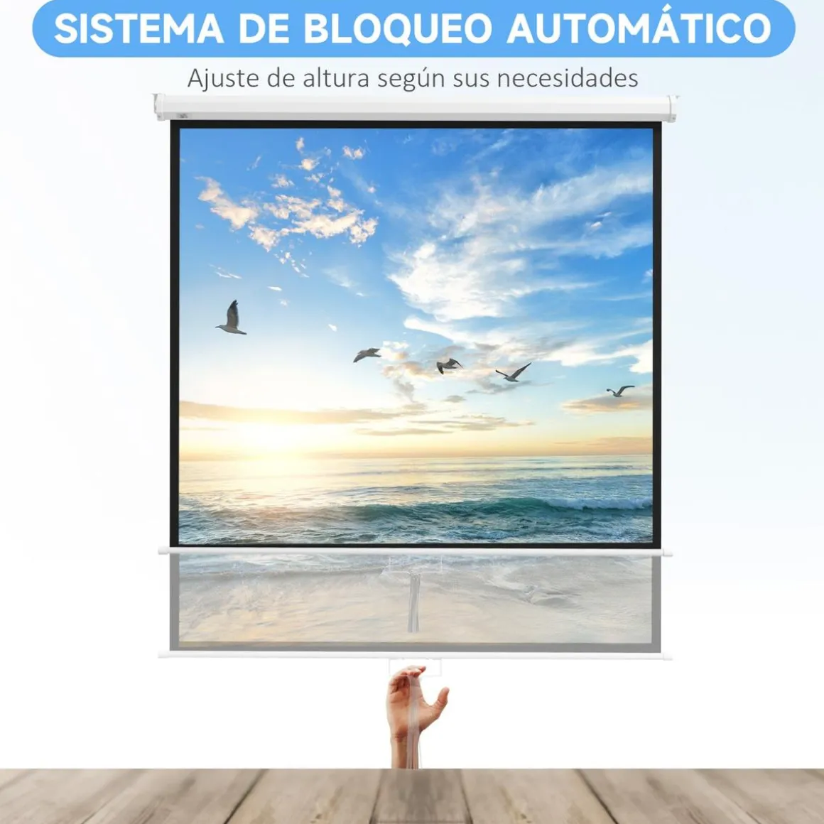 - La pantalla de proyector enrollable cuenta con un sistema de bloqueo automático suave con correas para facilitar el ajuste de la altura.