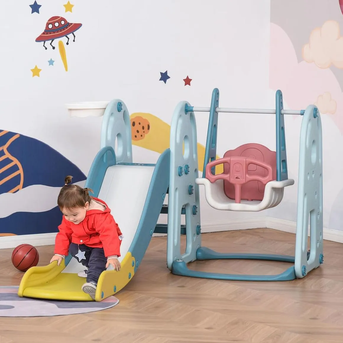 - 3 en 1, compuesto por tobogán, columpio con asiento ensanchada y aro de baloncesto.