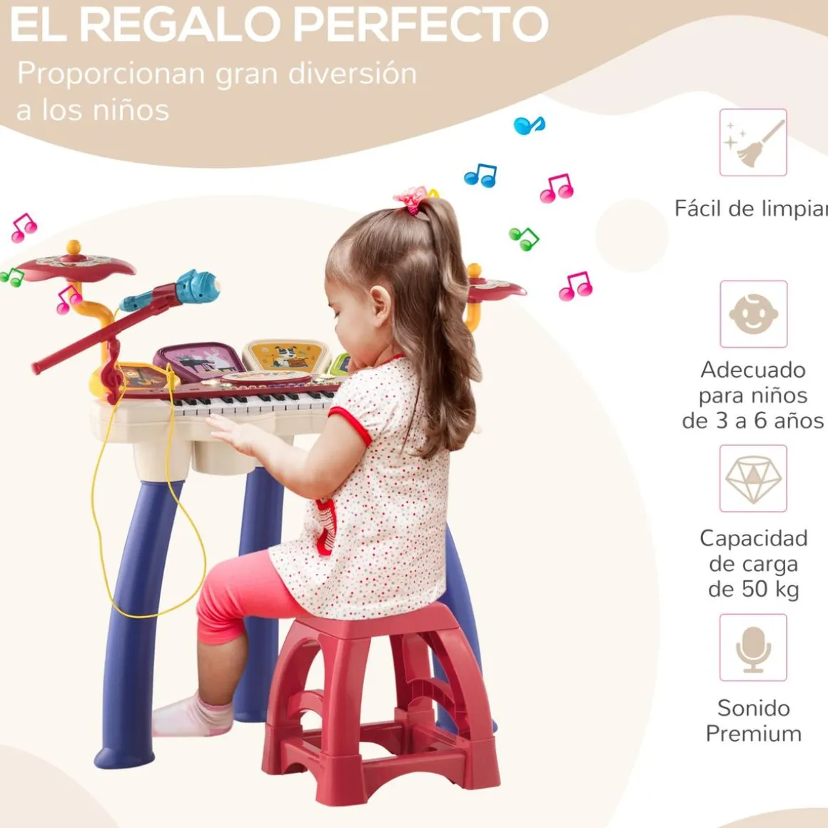 Homcom – Teclado electrónico 32 teclas con batería y taburete. ¿Has visto este piano y el set de batería para peques? Con 19 demos, 6 ritmos y 4 tonos, permite a los niños explorar su creatividad musical. Incluye tambores electrónicos, platillos y luces para un juego inmersivo. Ofrece grabación, amplificación con el micrófono, diseño adaptable y viene con baquetas y taburete. Es una forma ideal de introducir a los niños en el mundo de la música desde una edad temprana.