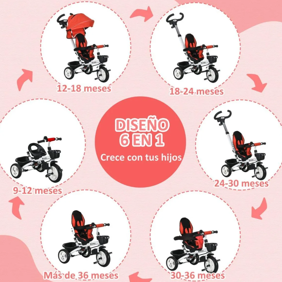 - Apto para niños desde 12 meses: El triciclo es apto para niños de 12 a 60 meses, con una carga máxima de 25 kg.