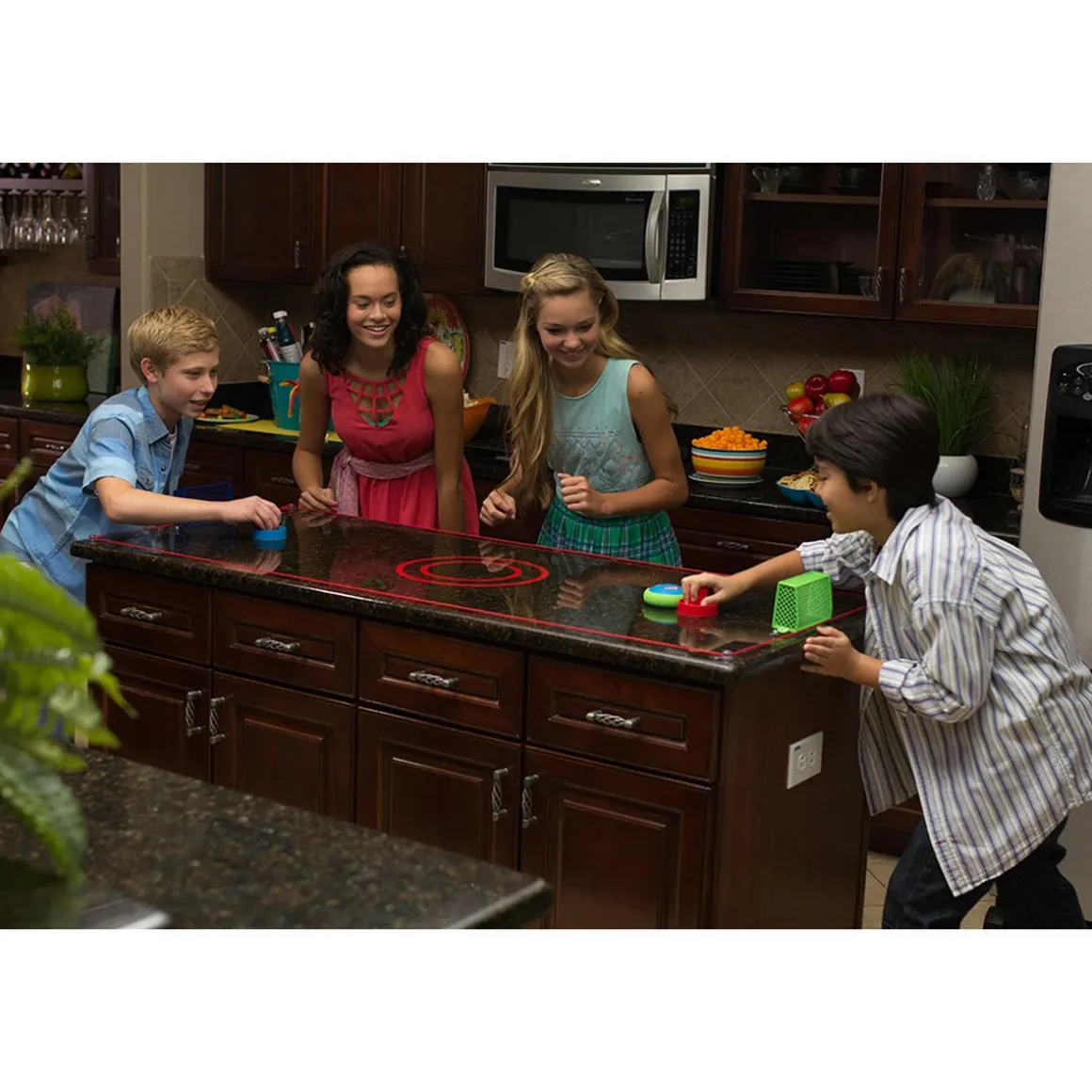 Hover Hockey – Mesa de Hockey Portátil, un playset que incluye 1 disco Hover Hockey, 2 mazos, 6.7 metros de cordón delimitador, 6 ventosas grandes para delimitar el área de juego, 4 ventosas pequeñas para colocar las porterías y 2 porterías. Hover Hockey es completamente portátil. ¡Puedes utilizarlo para jugar en casa, en un viaje, o incluso en tu fiesta de cumpleaños! ¡No gastes más tiempo y dinero en el salón recreativo! Asegura la cuerda que delimita el campo con las 6 ventosas de sujeción, coloca las porterías y ¡Listo! Ahora puedes convertir cualquier mesa en una mesa de hockey de aire, o incluso jugar en el suelo! El disco funciona con 2 pilas AAA (NO incluidas). Edad recomendada +6 años.