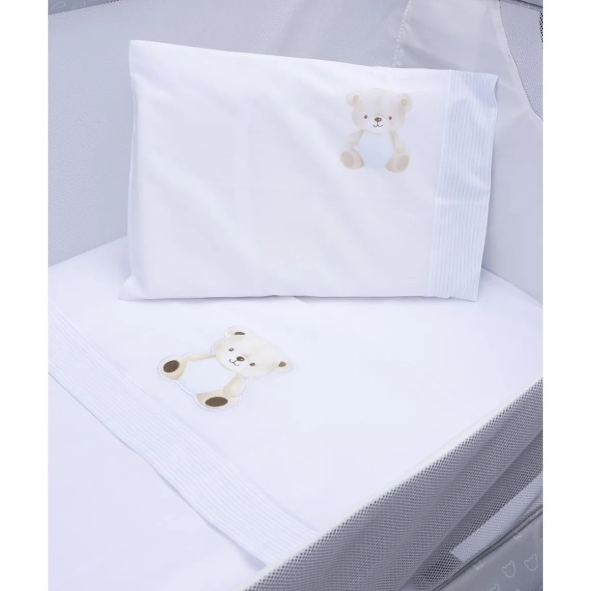 La sábana superior es blanca con un estampado all-over en azul y la imagen central de un tierno osito. La funda de almohada repite el mismo diseño. La bajera, blanca y lisa, también puede usarse como encimera.
