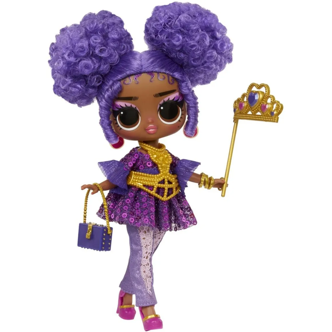 Cassie Cool viene con su increíble vestido morado, destellos de una elegante cadena de perlas, pantalones con diseño en encaje, un bolso con tachuelas que es puro rock, zapatos a la medida de una estrella y una corona que le da el toque final de princesa del pop.
