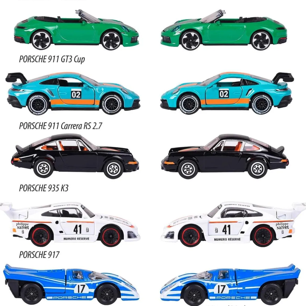 En este set, se encuentran 5 de los vehículos más emblemáticos de Porsche. Incluye los modelos Porsche 911 GT3 Cup, Porsche 935 k3, Porsche 911 Carreras S, Porsche 911 Carreras RS 2.7 y Porsche 917. Cada coche de este pack de Majorette Porsche Motorsport 5 Pieces Giftpack, está diseñado con detalles increíbles, por lo que se parecen mucho a sus contrapartes reales. Los niños se divertirán horas mientras aprenden a apreciar el diseño y la calidad de estos famosos coches.