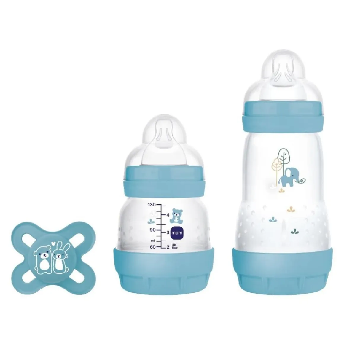 MAM – Kit de inicio biberón + chupete azul, diseñado para ofrecer una transición suave y segura del pecho al biberón desde el nacimiento.