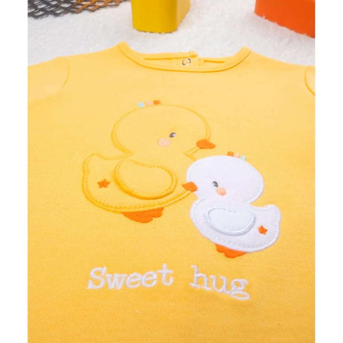 Tierna ranita unisex. La prenda se presenta en una sola pieza con patucos coordinados y se desarrolla en color amarillo total con diseño coordinado. El ajuste es suave y práctico gracias a botones automáticos en la parte trasera y en la entrepierna. La prenda es de algodón oeko – tex, probado para sustancias nocivas garantiza alta seguridad. Accesorios no a la venta. El paquete contiene solo la prenda de vestir