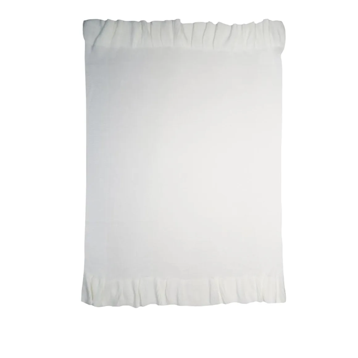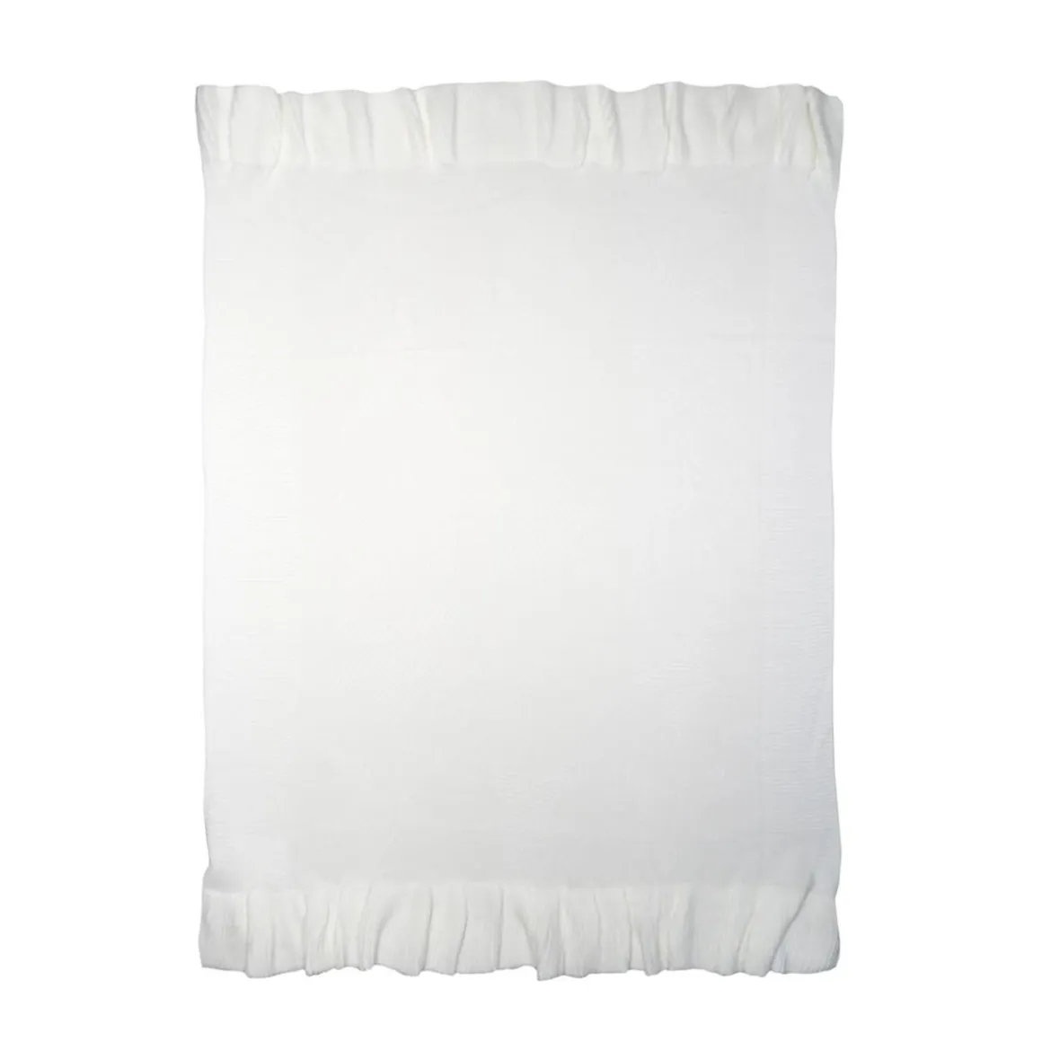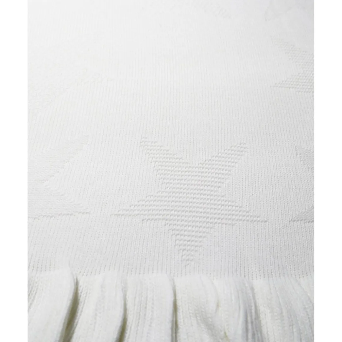 Esta suave manta está elaborada en hilo de color blanco y decorada con delicados volantes en los bordes, además de un bordado tonal de grandes estrellas que le confieren un toque elegante y acogedor.