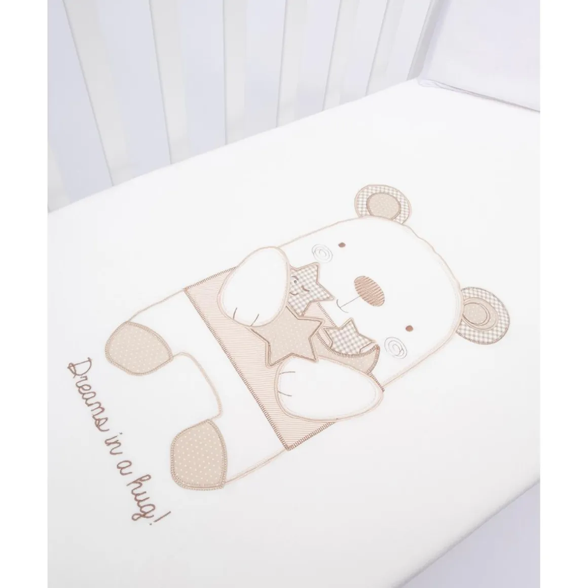 Esta adorable manta de chenilla para cuna está decorada con un tierno osito y la inscripción «Dreams in a hug!», proporcionando calidez y confort a tu bebé durante el descanso.