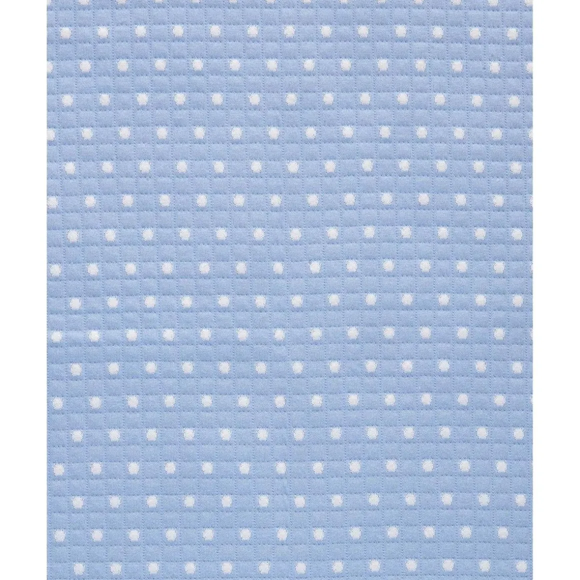 Descubre esta encantadora manta de cuna estival, perfecta para los meses más cálidos del año. Confeccionada en suave algodón, presenta un precioso diseño en tono azul cielo con un elegante borde blanco y pequeños motivos de puntos blancos que le aportan un toque de dulzura.