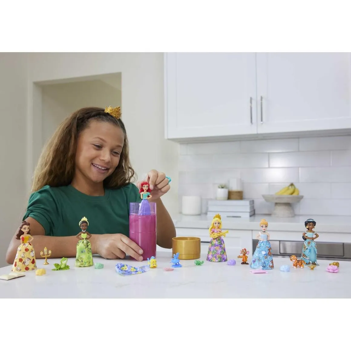Bienvenido a la excitante aventura de revelar y descubrir las maravillosas princesas de Disney con agua. Cada muñeca te espera cubierta con un misterioso color que al poner en agua revelará a tu princesa. Entre las posibilidades están algunas de las más queridas princesas como Ariel, Cenicienta, Tiana, Bella, Jasmine y Rapunzel. No solo descubrirás a tu muñeca sino también varios accesorios mágicos que completarán la diversión.