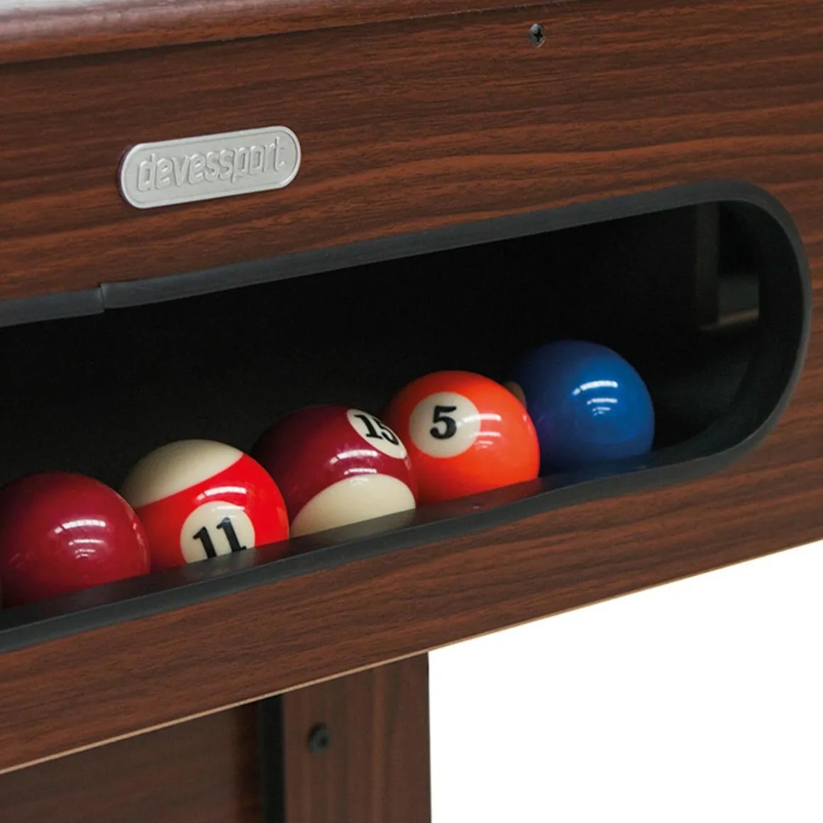 El billar cuenta con sistema de retorno de bolas. Incluye todos los accesorios para empezar a jugar al billar: 1 Juego de bolas (diámetro 5,72 cm), 2 tacos (144,78 cm), triángulo, tiza y cepillo. Medidas de la mesa: 221 x 122 x 81 cm. Medidas del campo de juego: 198,5 x 99,5 cm. Peso: 117 kg.