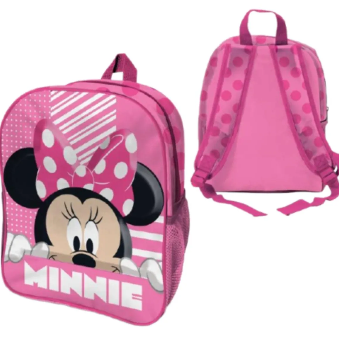 Esta mochila escolar para niños con diseño 3D de Minnie Mouse combina diversión, comodidad y funcionalidad. Cuenta con una gran bolsa principal y un compartimento frontal rígido con el personaje en relieve, además de un bolsillo lateral de malla para la botella. Su tamaño compacto (22 x 27 x 9 cm aproximadamente), ligero peso y correas ajustables permiten que los niños la lleven con comodidad durante el colegio o excursiones. Fabricada en poliéster resistente, es perfecta para transportar libros, ropa o accesorios. Su diseño colorido y divertido hace que sea un accesorio imprescindible para los más pequeños, combinando estilo y practicidad en un solo artículo.