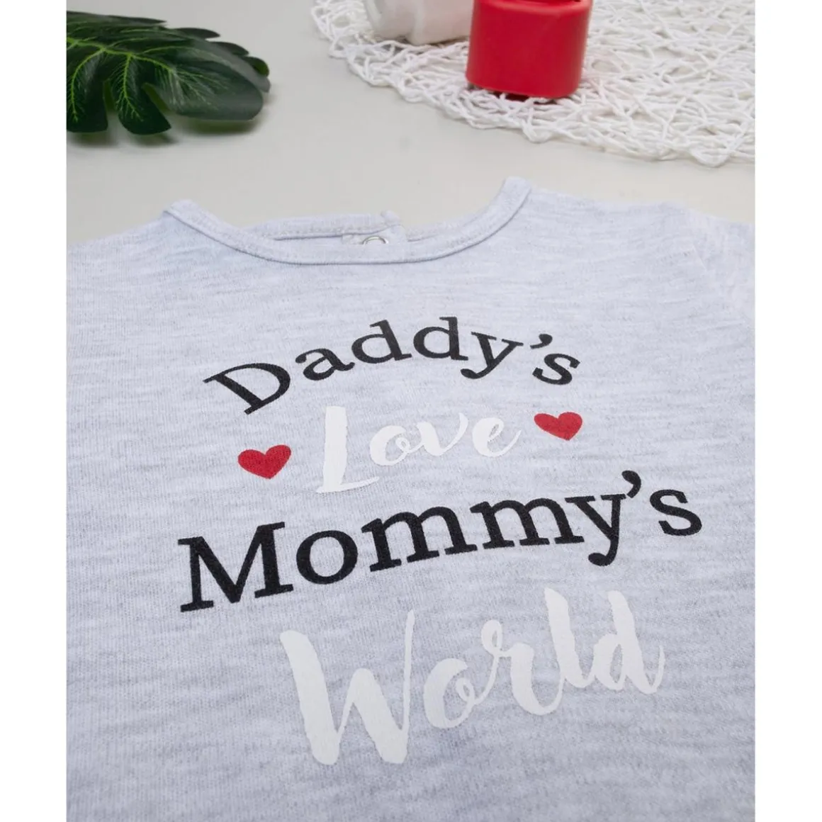 Tierna pelele unisex. La prenda se presenta en una sola pieza con patucos coordinados y se desarrolla en un total gris claro con estampado «Daddy Mommy» en negro y rojo. El ajuste es suave y práctico gracias a los botones automáticos en la parte trasera y la entrepierna. La prenda es de algodón oeko-tex, probado para sustancias nocivas garantiza alta seguridad. Accesorios no a la venta. El embalaje contiene solo la prenda de vestir