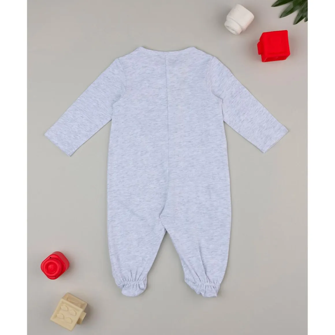 Dulce pelele de jersey unisex. La prenda se presenta en una sola pieza con escarpines coordinados y se desarrolla en un total gris con estampado coordinado. El ajuste es suave y práctico gracias a los botones automáticos en la entrepierna y en la parte trasera. La prenda es de algodón oeko – tex, probado para sustancias nocivas garantiza alta seguridad. Accesorios no a la venta. El paquete contiene solo la prenda de vestir
