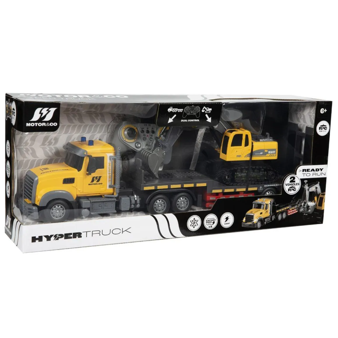 - Contenido de la caja: 1 camión teledirigido, 1 excavadora teledirigida, 1 control remoto de 2,4 GHz que requiere 2 pilas LR6 (no incluidas).