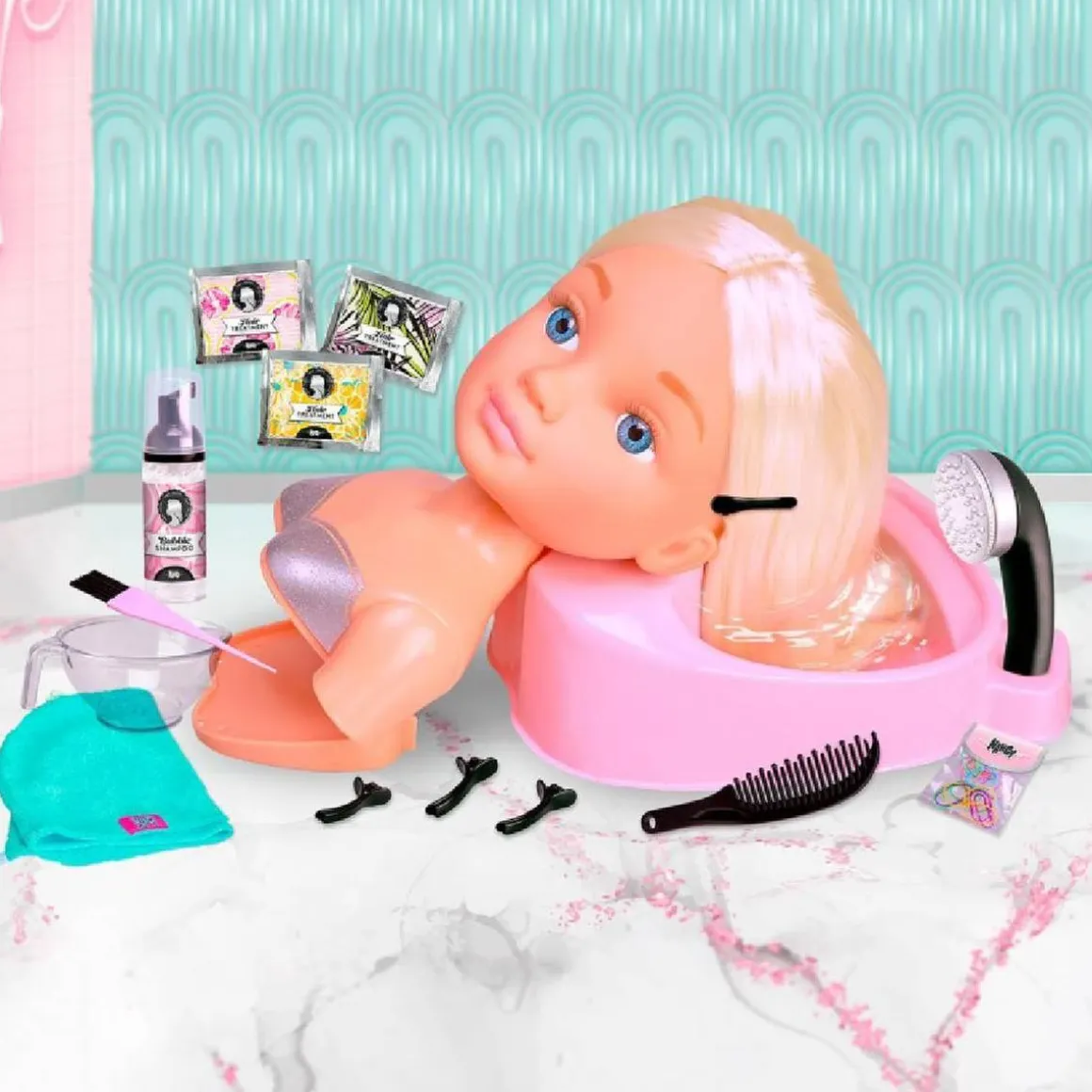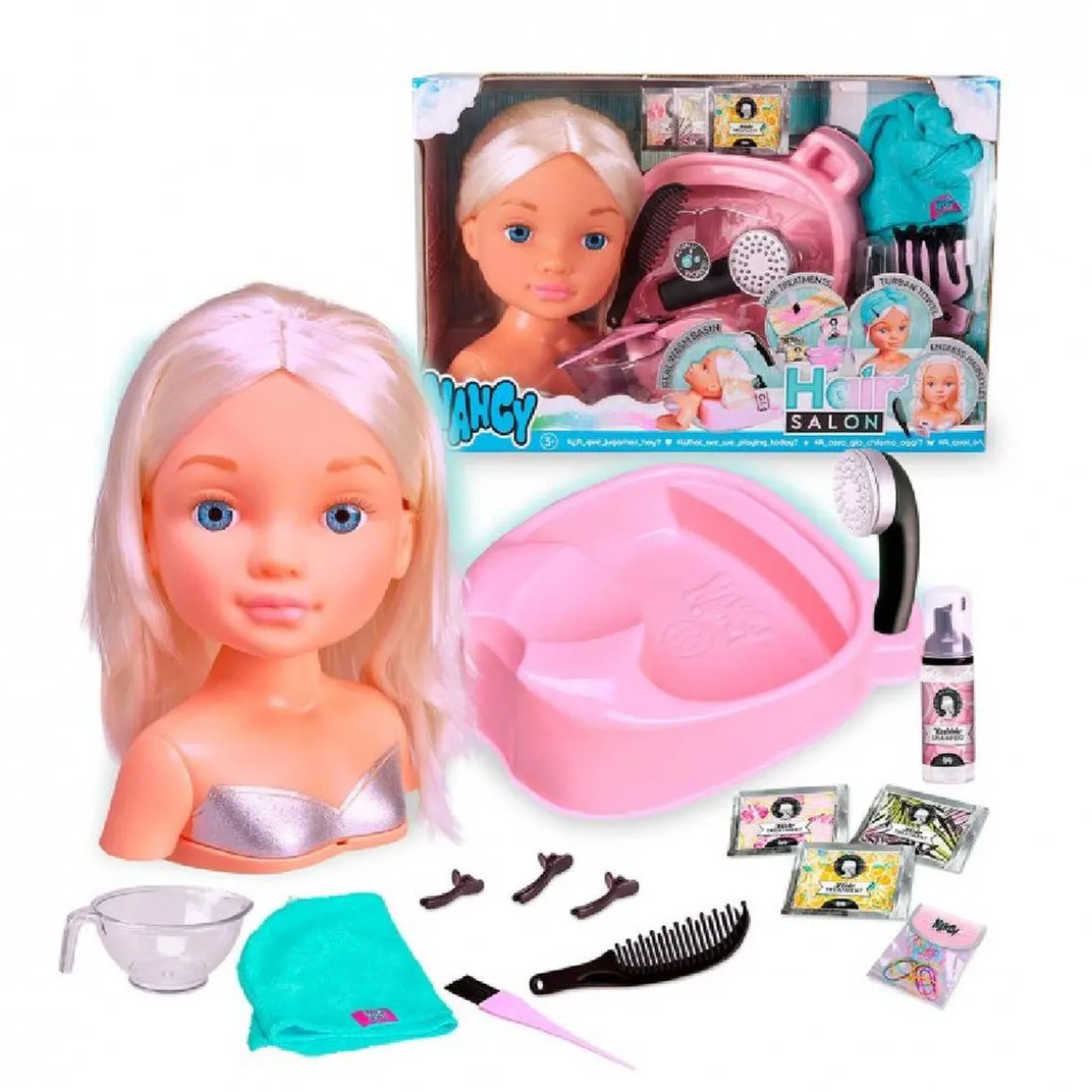 1 busto de muñeca Nancy rubia, 1 lava cabezas rosa, 3 sobres con mascarilla y tratamientos, 1 peine negro, 1 bol, 1 brocha rosa, 1 spray con champú, 4 pinzas negras y 1 turbante turquesa.