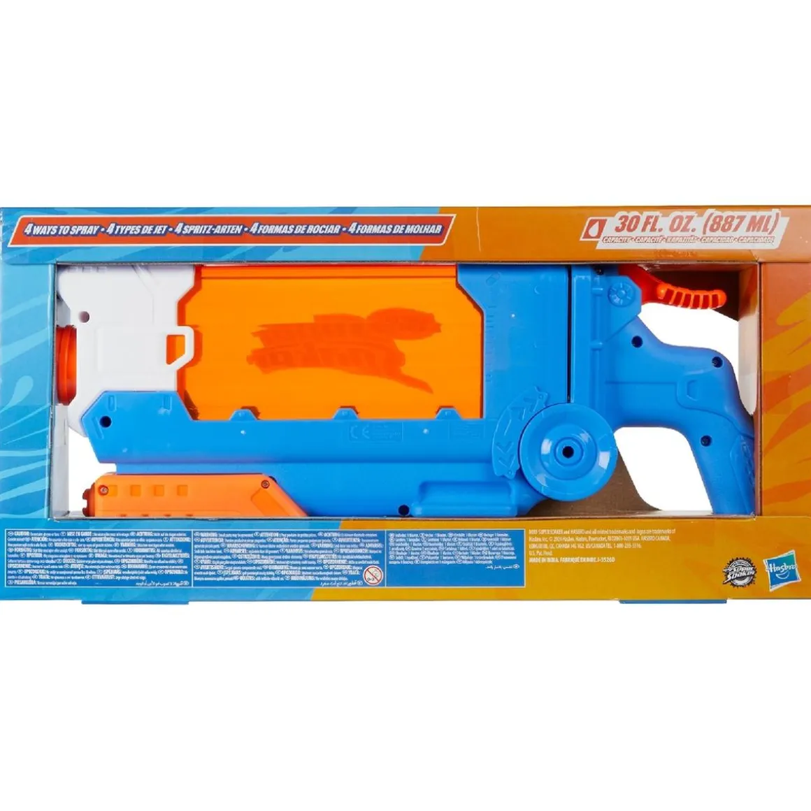 Es una pistola de agua que cuenta con 4 estilos de rociado distintos para que elijas la manera que mas te guste de empapar a tus amigos jugando al aire libre; puede ser un chorro fino, un chorro único grande, un chorro de dispersión y un chorro rociador de abanico en ángulo para empaparlos a todos.