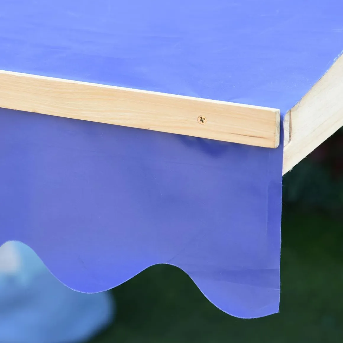 - Color: madera natural y toldo azul