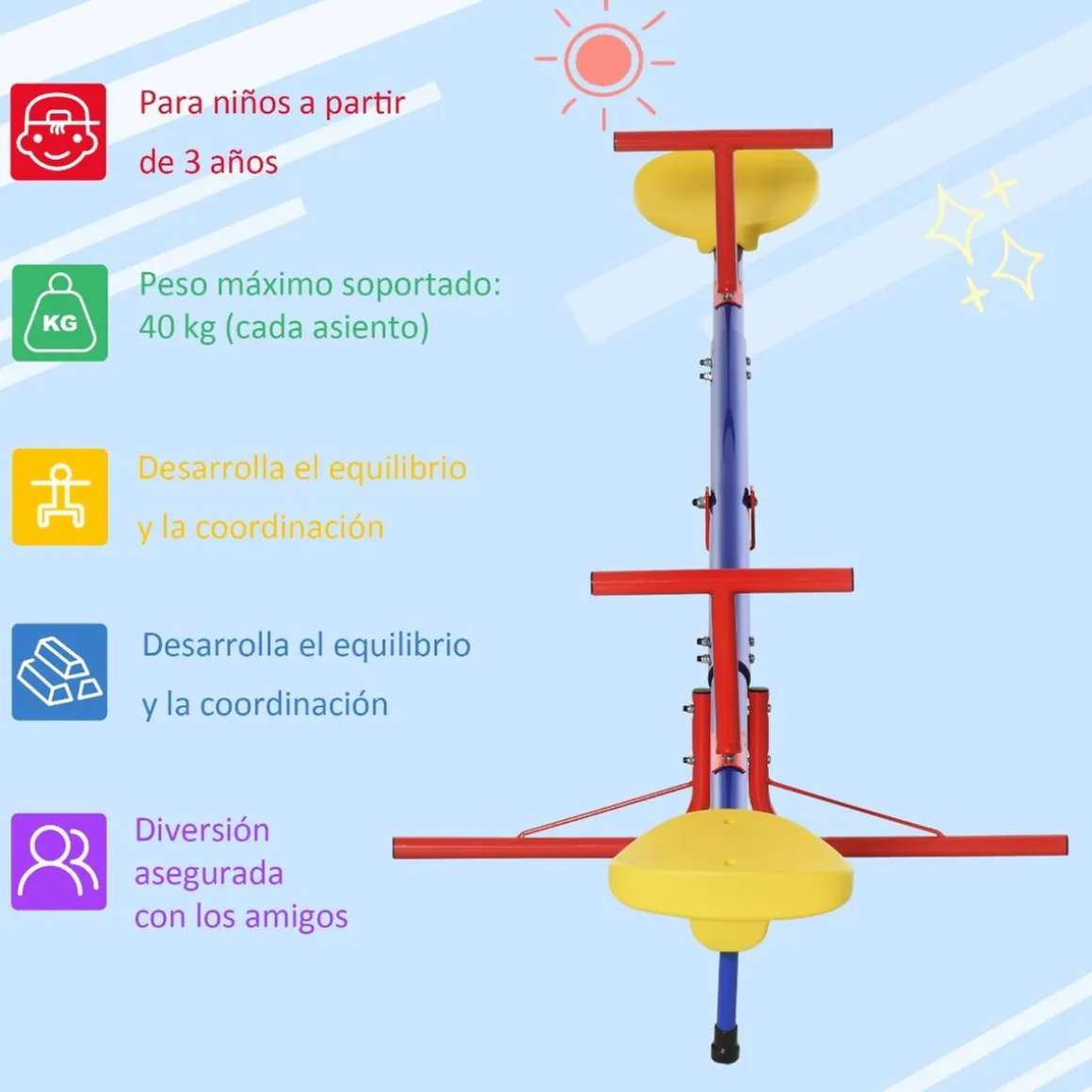 La base ancha de este sube y baja está compuesta por 4 varillas que garantizan la estabilidad y seguridad del balancín y pueden soportar hasta 80 kilos, 40 kg en cada sillín.