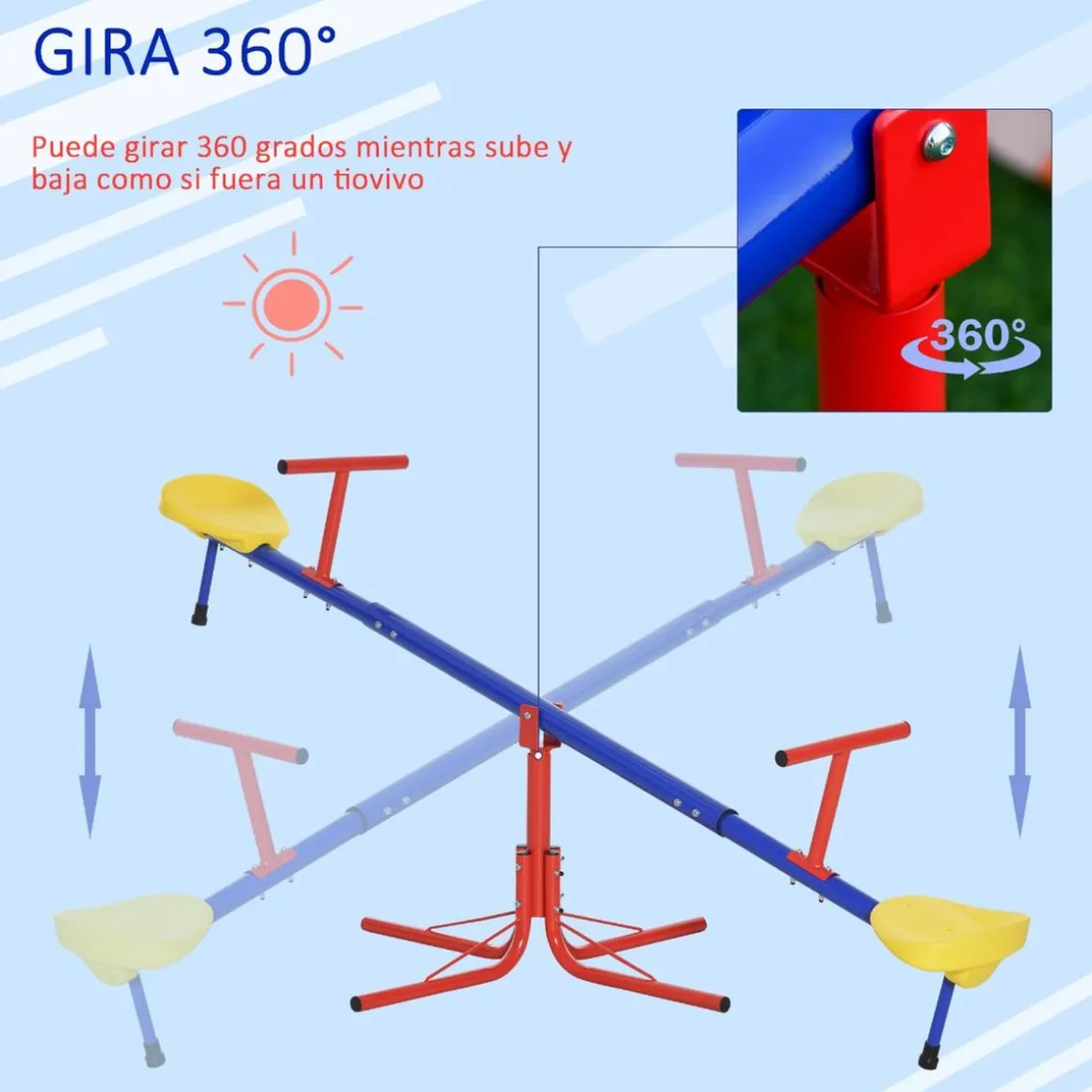 – El balancín sube y baja y gira 360 grados gracias a su eje giratorio