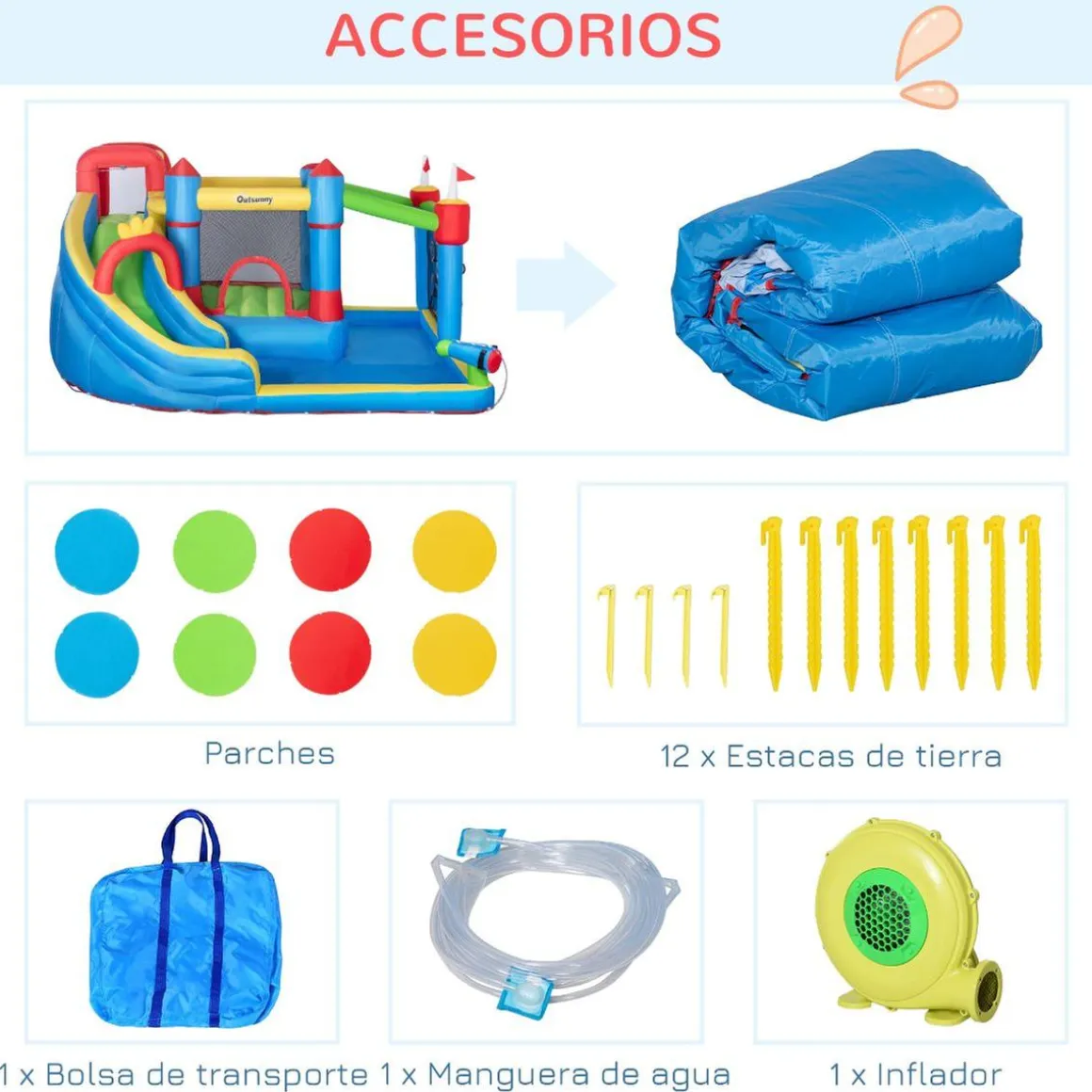 Outsunny – Castillo hinchable 6 en 1 con tobogán, un castillo inflable multicolor con 1 tobogán, 1 piscina de agua, 1 trampolín, 1 muro de escalada, 1 lanzador de agua y una red con objetivos. Deja que tus hijos se lo pasen genial con sus amigos mientras corren, escalan, corren, saltan y se deslizan por el tobogán.