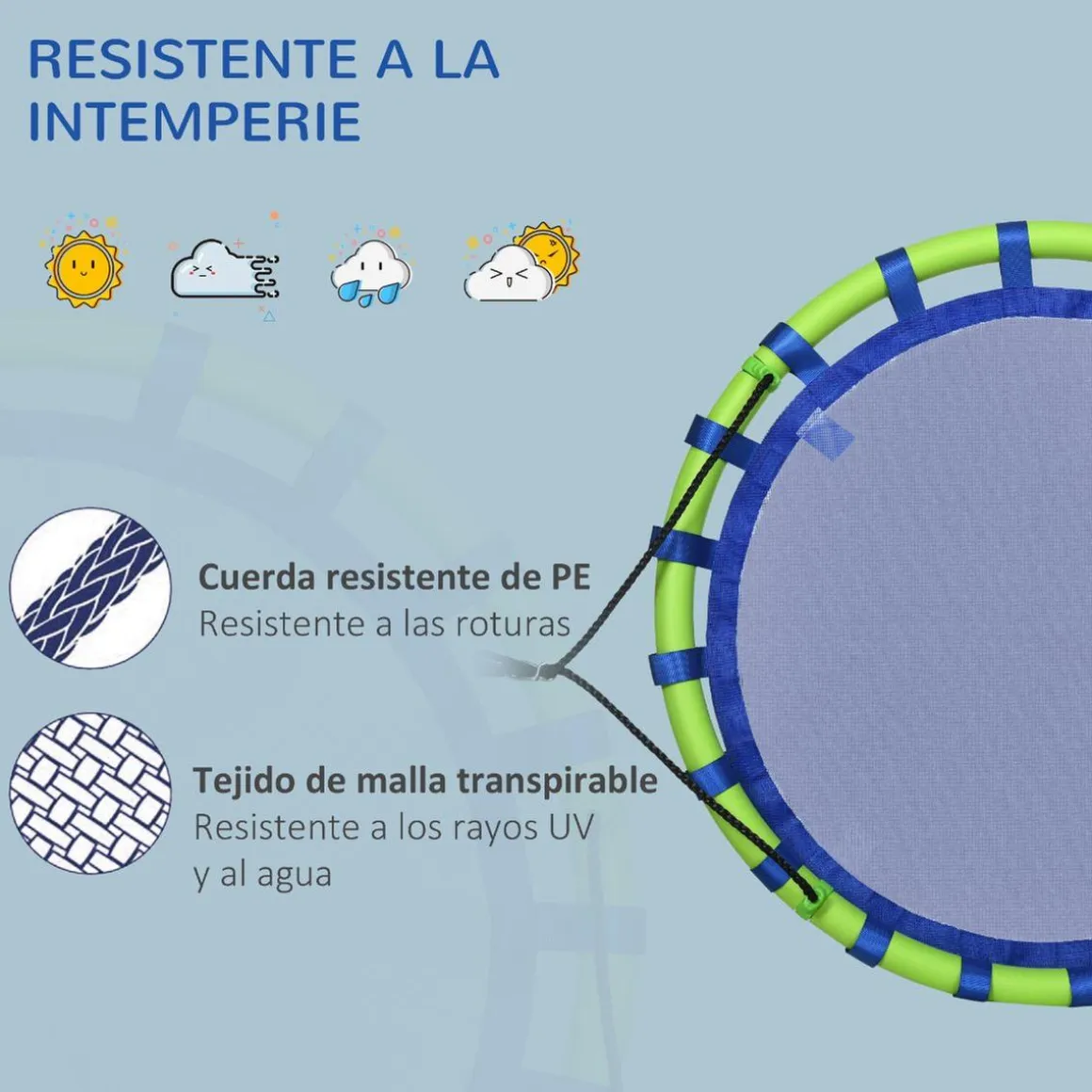 Este columpio de Outsunny está hecho con un marco resistente de metal y revestido con tela Oxford proporciona un apoyo fuerte lo suficientemente resistente para colgar en una rama de árbol o un soporte de columpio y soportar hasta 150 kg. Las cuerdas se pueden regular en altura para ajustar según tus necesidades.