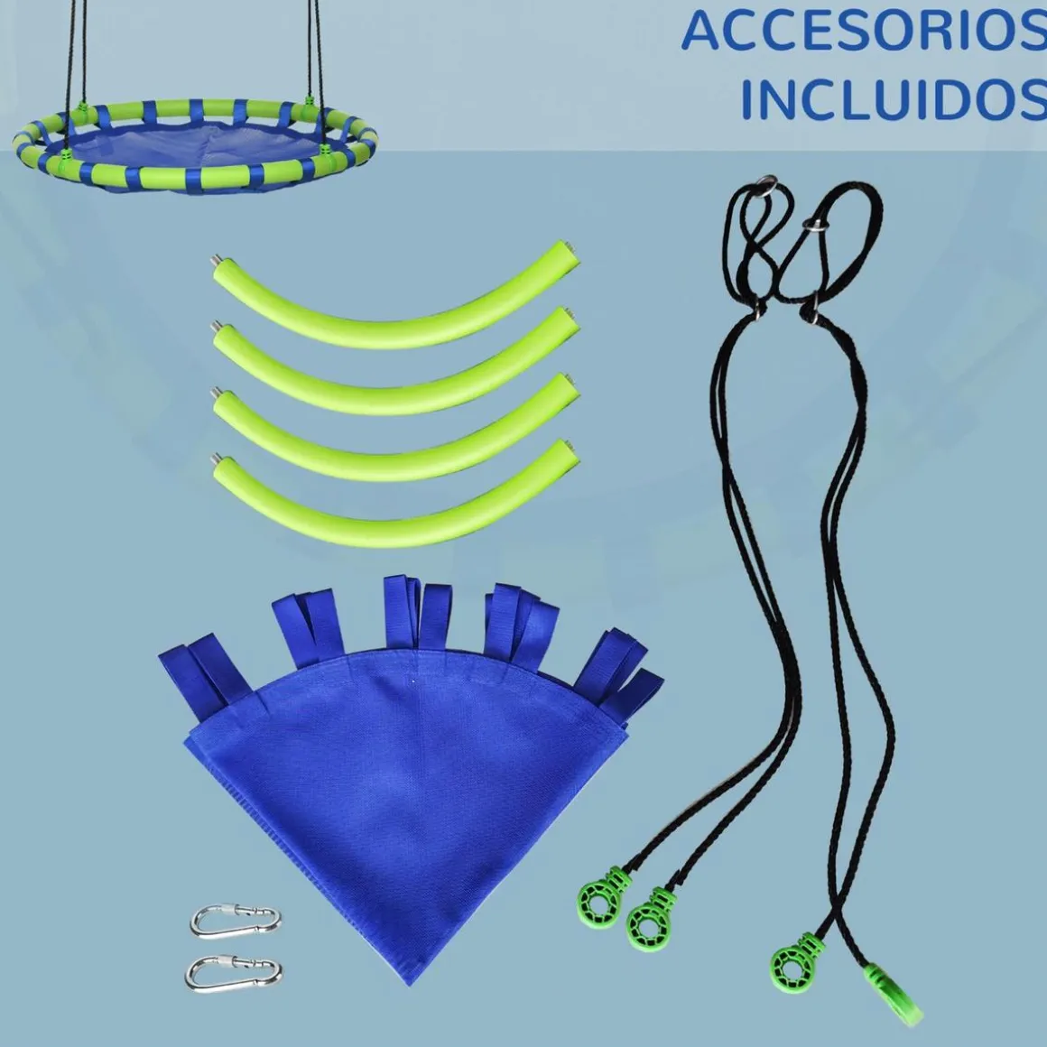 - Se puede colgar de un soporte de columpio existente o de dos cuerdas en un árbol.