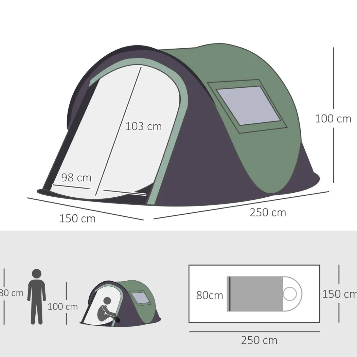 Outsunny – Tienda de campaña Pop Up 250x150x100 cm Verde, esta tienda de campaña es la solución perfecta para protegerse del sol y del viento en el camping, el pícnic, la playa, etc. Ofrece espacio suficiente para 1-2 personas.