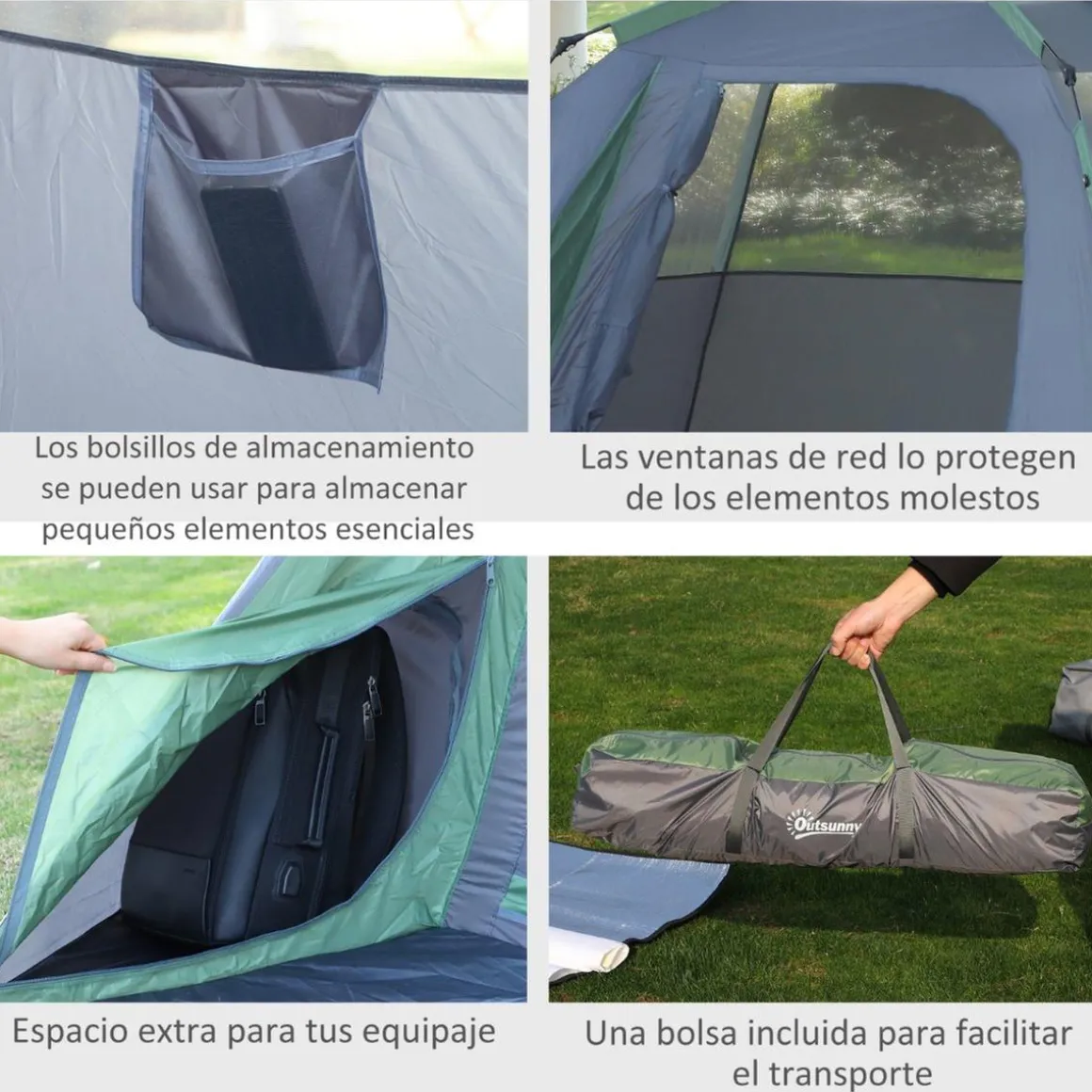 Esta tienda de campaña de diseño 2 en 1 de Outsunny es perfecta para disfrutar de la naturaleza con familia y amigos. Su diseño 2 en 1 permite utilizar por separado su cubierta superior, de ese modo siempre podrás disfrutar de una carpa refugio donde la necesites. Incluye pequeño bolsillo y compartimento extra para dejar tu maleta. Y viene con una bolsa de transporte para poder guardarla y llevártela cómodamente a todas partes.