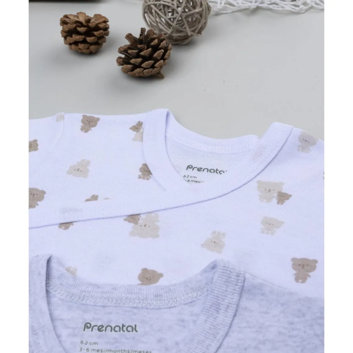 Este pack de bodies de manga larga incluye dos modelos básicos en blanco y gris, decorados con estampados de ositos. Su diseño cruzado y cierre de automáticos en la entrepierna facilita vestir al bebé y cambiar pañales con rapidez.