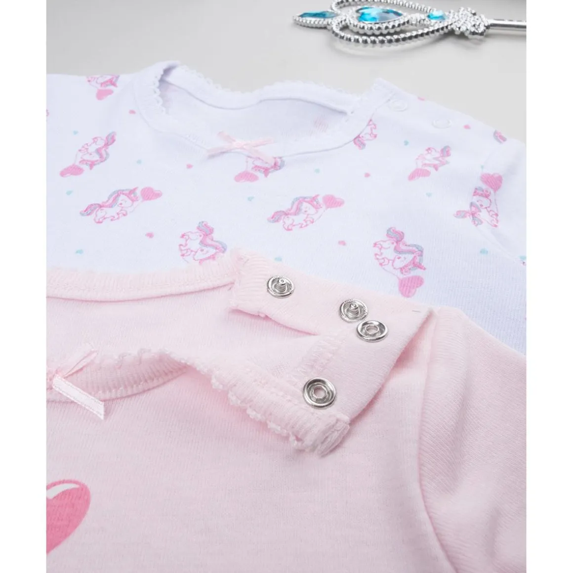Pack básico de 2 bodies para niña de algodón orgánico. Las prendas se desarrollan sobre base blanca y rosa con pequeños dibujos a juego. El ajuste es suave y práctico gracias a los botones automáticos en la parte trasera y en la entrepierna. La prenda es de algodón oeko-tex, probado para sustancias nocivas garantiza alta seguridad. Accesorios no a la venta. El paquete contiene solo la prenda de vestir